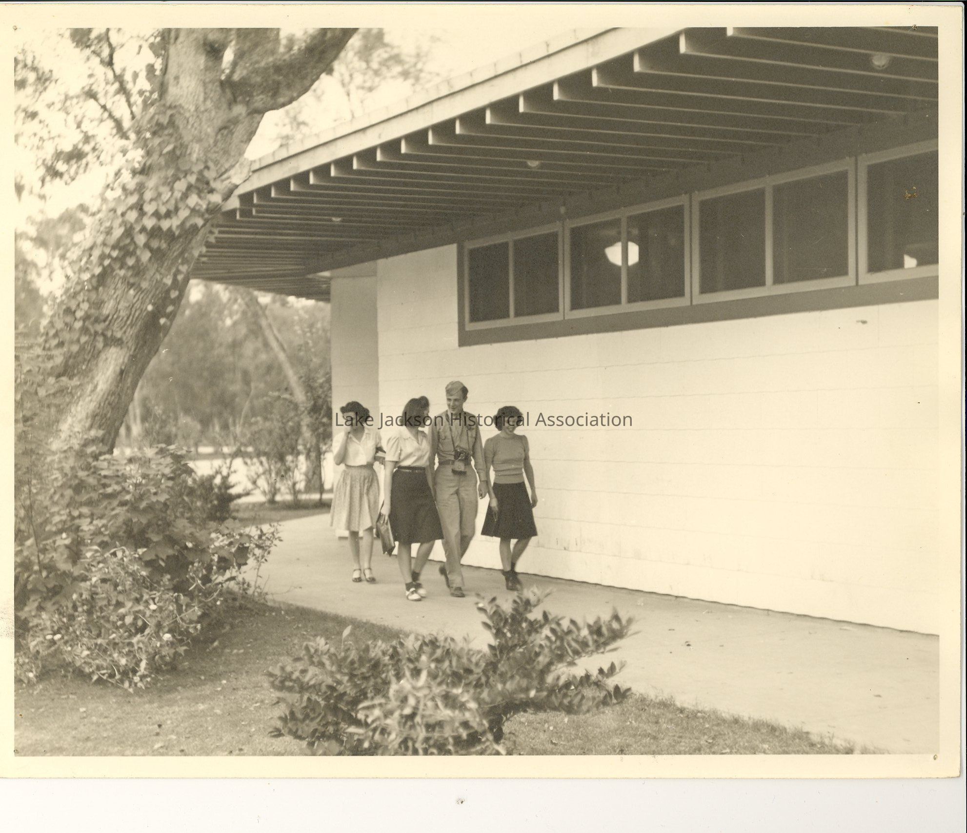 A black and white photo of the Lake Drug area in Lake Jackson. A soldier and three girls are walking on the sidewalk outside the businesses.Collection