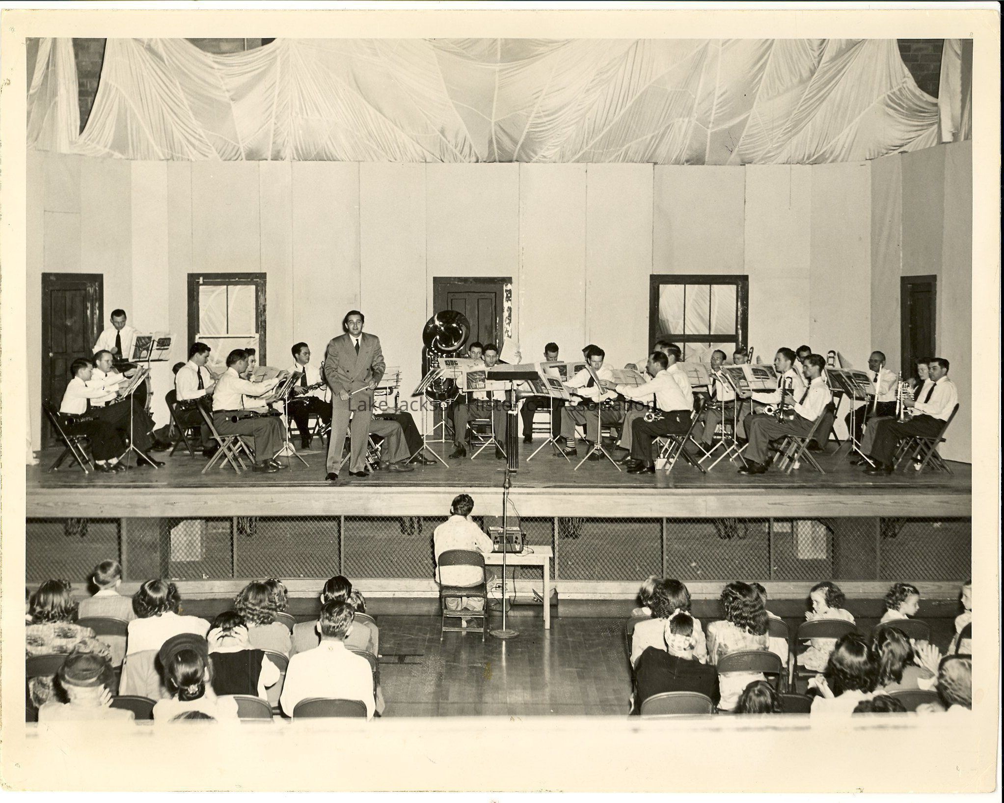 A black and white photo of a community concert.Collection