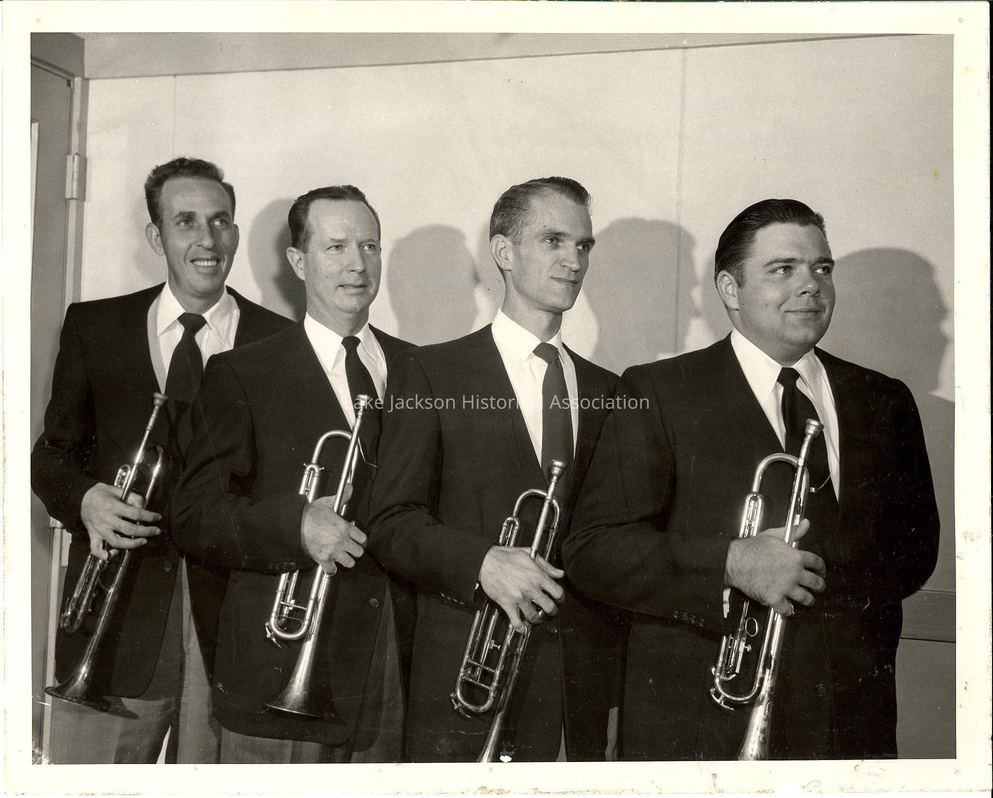 A black and white photo of four trumpet players including Stan Smock, T. J. Dunbar, Jr., Stan Gamble, and Gene Markley.Collection