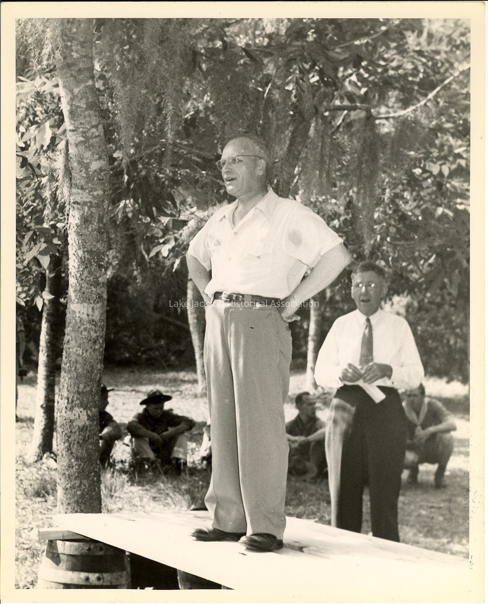 1 black and white photo of Dr. Beutel making speach at opening ceremonies with Scouts in the background.Collection