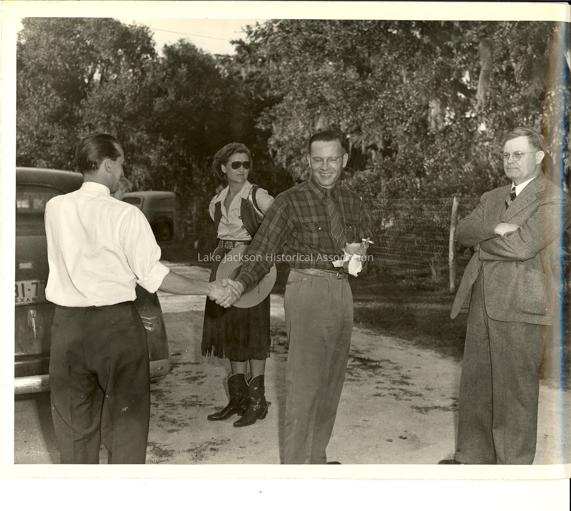 A black and white photo of a gathering of guests at Dr. Beutel's home in Lake Jackson. Guests include personnel from Dow Midland, Michigan and Dow Texas Division.Collection