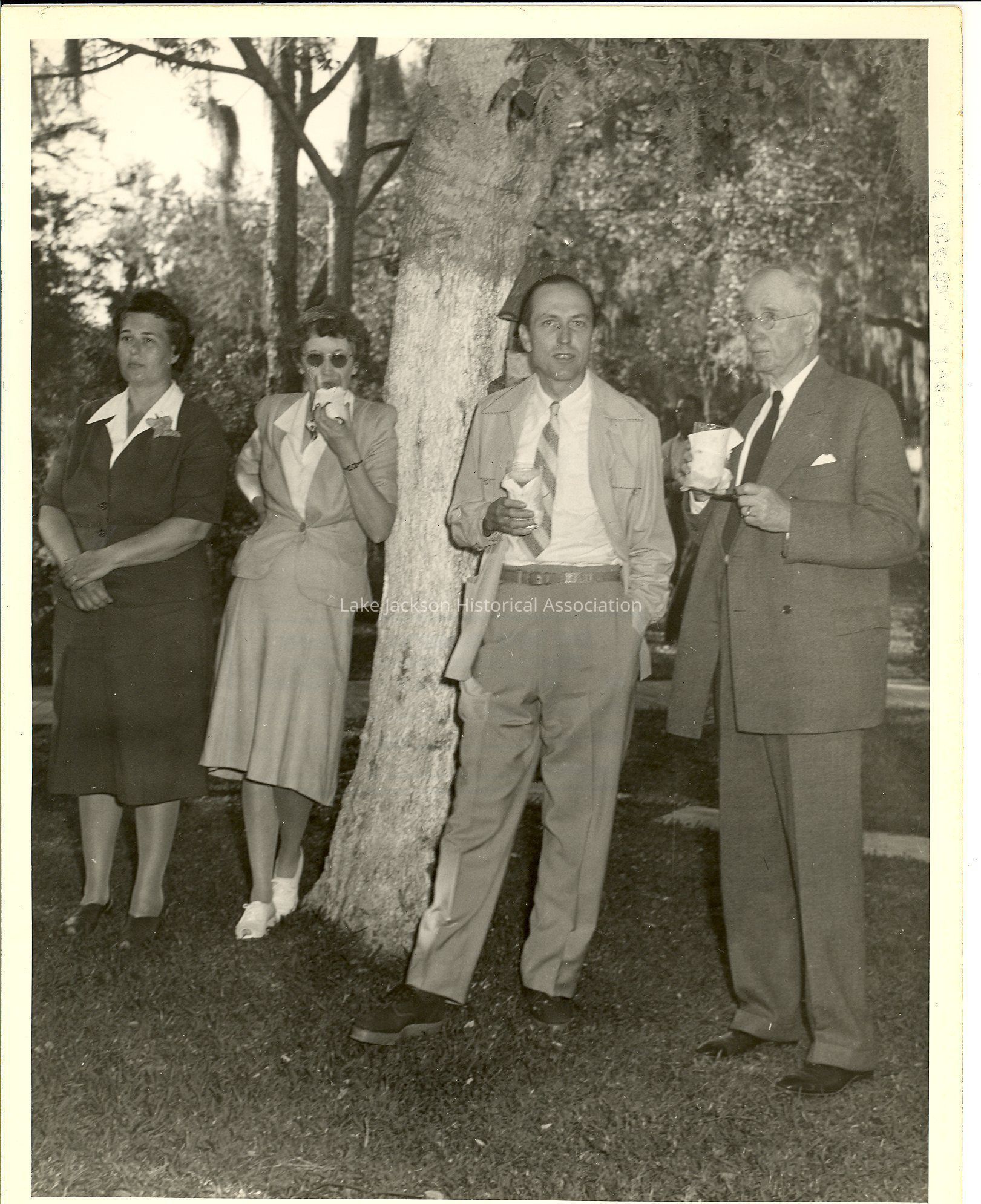 A black and white photo of a gathering at Dr. Beutel's home in Lake Jackson. Guests include personnel from Dow Midland, Michigan and Dow Texas Division. Photo includes Mr. & Mrs. Nelson D. Griswold and E. O. Barstow.Collection
