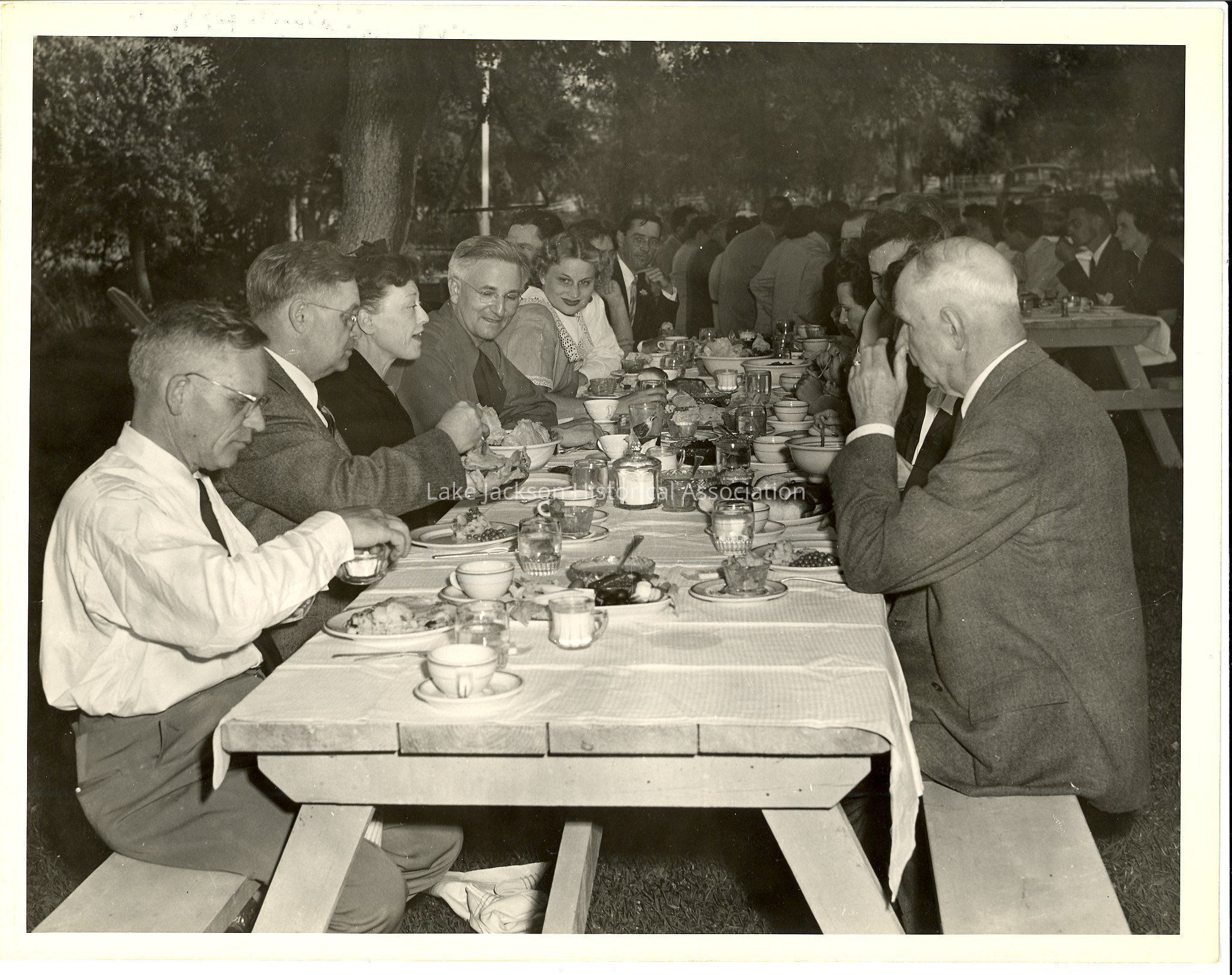 A black and white photo of a gathering at Dr. Beutel's home in Lake Jackson. Guests include personnel from Dow Midland, Michigan and Dow Texas Division. Photo includes Dr. Beutel, Mark Putnam, Willard Dow, Gretchen Bryan, and E.O. Barstow.Collection