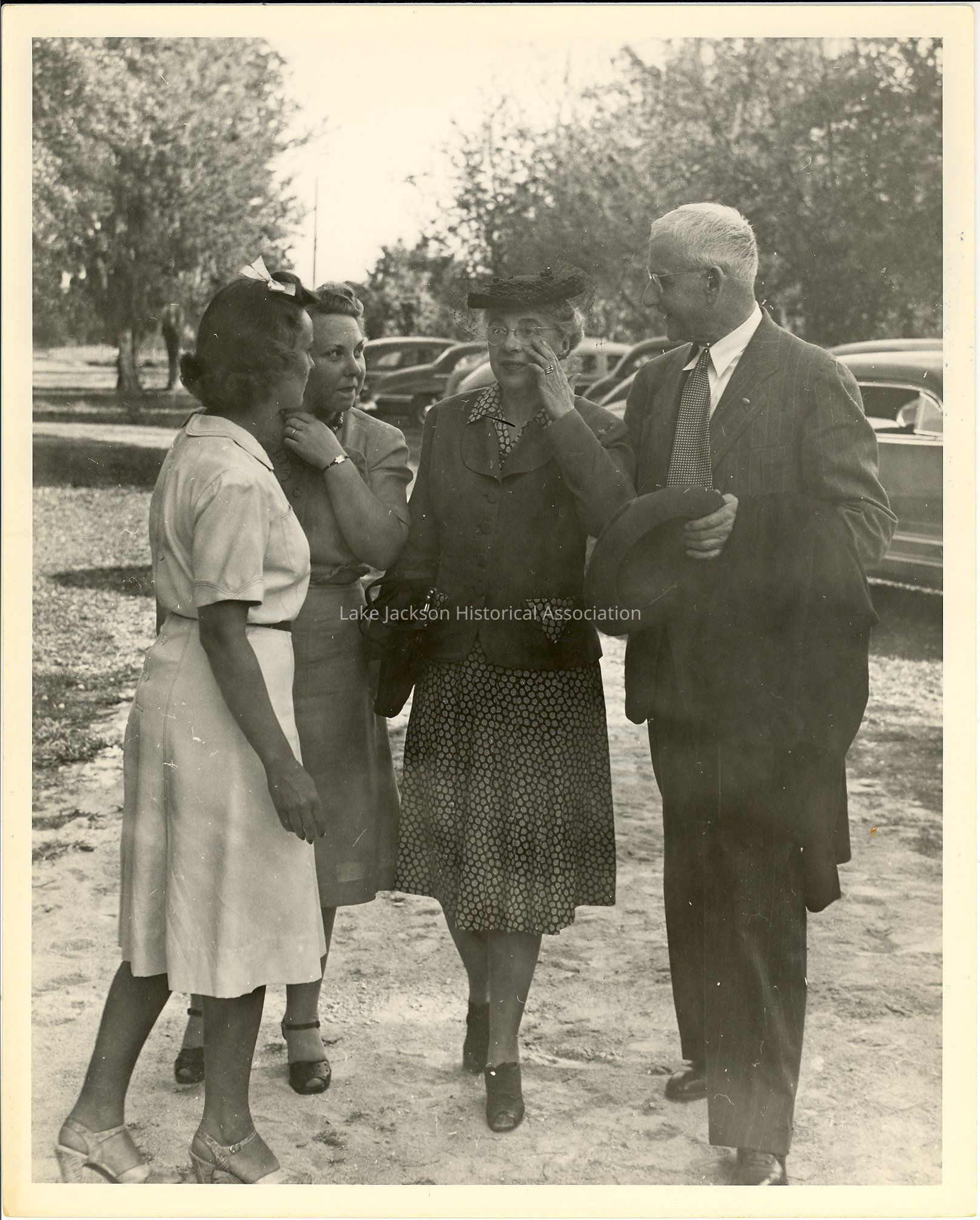 A black and white photo of a gathering at Dr. Beutel's home in Lake Jackson. Guests include personnel from Dow Midland, Michigan and Dow Texas Division. Photo includes Pat Beutel and Dr. & Mrs. Barstow.Collection
