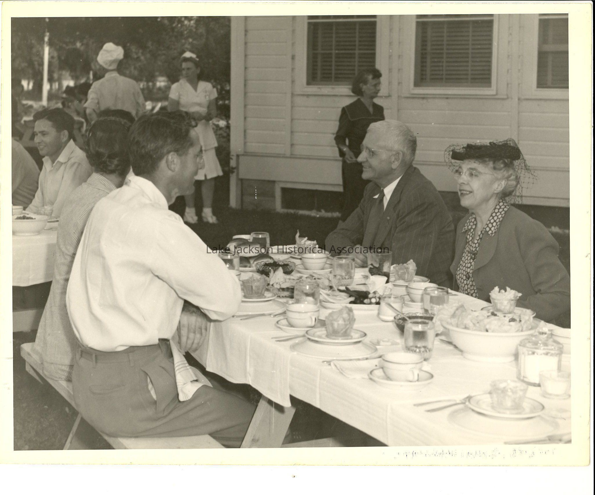A black and white photo of a gathering at Dr. Beutel's home in Lake Jackson. Guests include personnel from Dow Midland, Michigan and Dow Texas Division. Photo includes Dr. and Mrs. Barstow.Collection