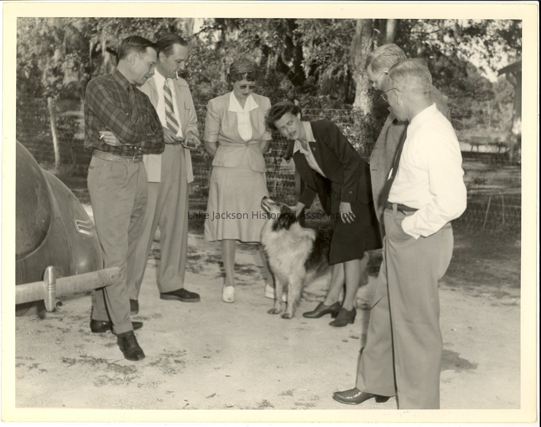 A black and white photo of a gathering at Dr. Beutel's home in Lake Jackson. Guests include personnel from Dow Midland, Michigan and Dow Texas Division. Photo includes Dr. Beutal, Mark Putnam, Mr. and Mrs. Nelson Griswold, and Ivan Oden.Collection