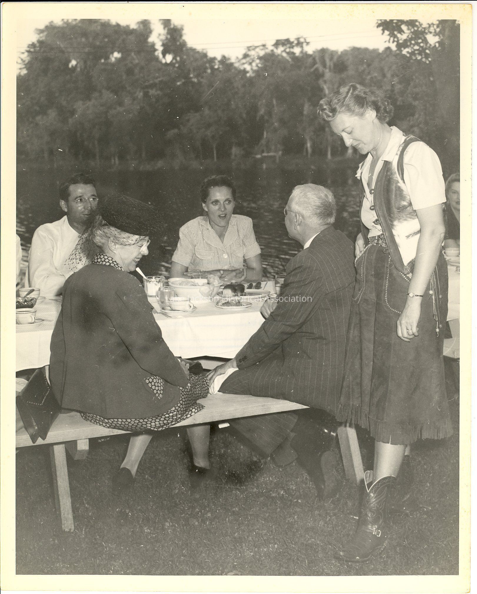 A black and white photo of a gathering at Dr. Beutel's home in Lake Jackson. Guests include personnel from Dow Midland, Michigan and Dow Texas Division. Photo includes Dr. and Mrs. Barstow.Collection