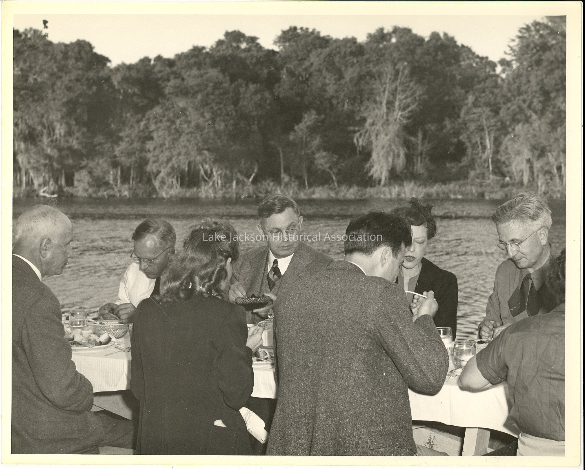 A black and white photo of a gathering at Dr. Beutel's home in Lake Jackson. Guests include personnel from Dow Midland, Michigan and Dow Texas Division. Photo includes Dr. Beutel, Mark Putnam, and Willard Dow.Collection