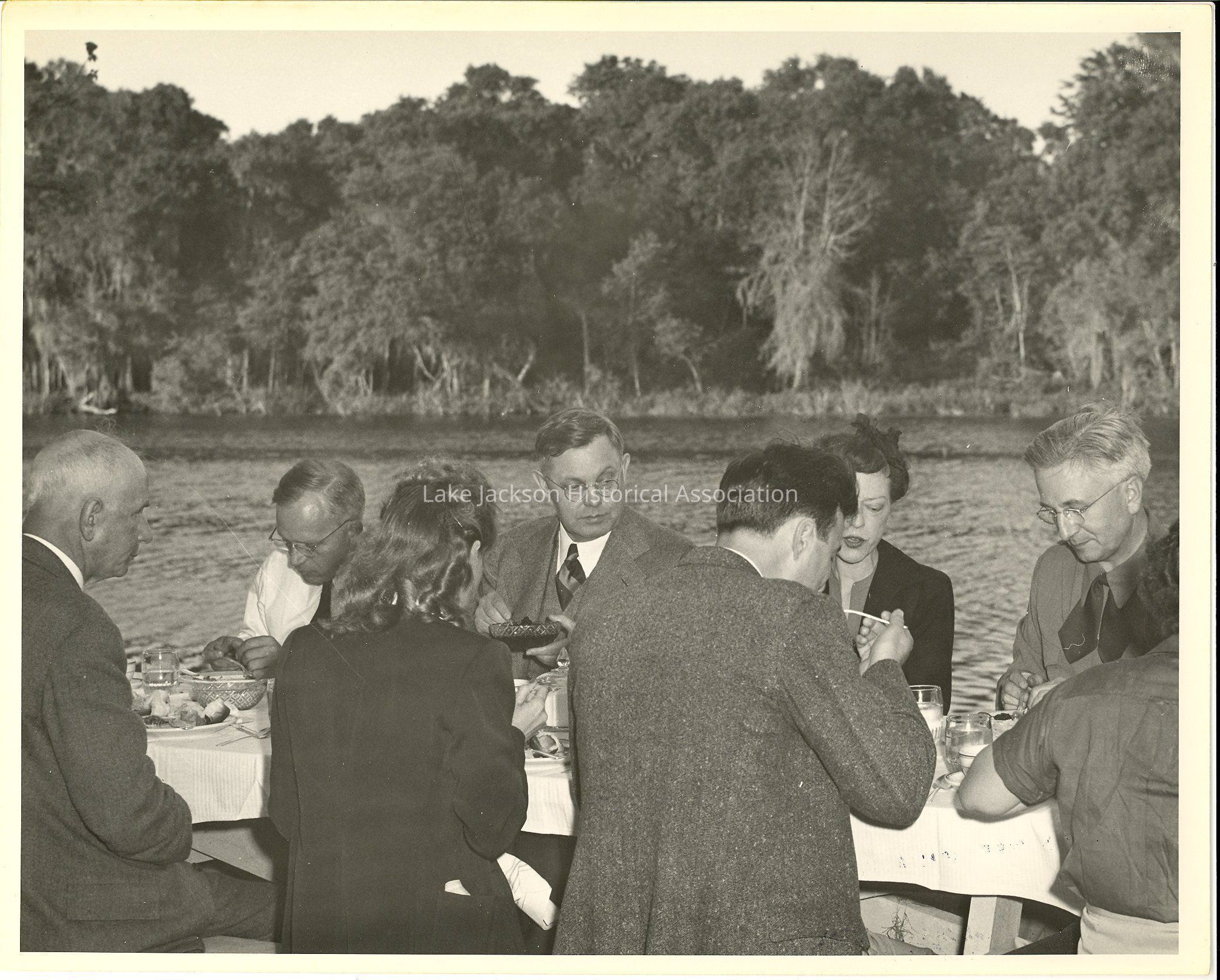 A black and white photo of a gathering at Dr. Beutel's home in Lake Jackson. Guests include personnel from Dow Midland, Michigan and Dow Texas Division. Photo includes Dr. Beutel, Mark Putnam, and Willard Dow.Collection