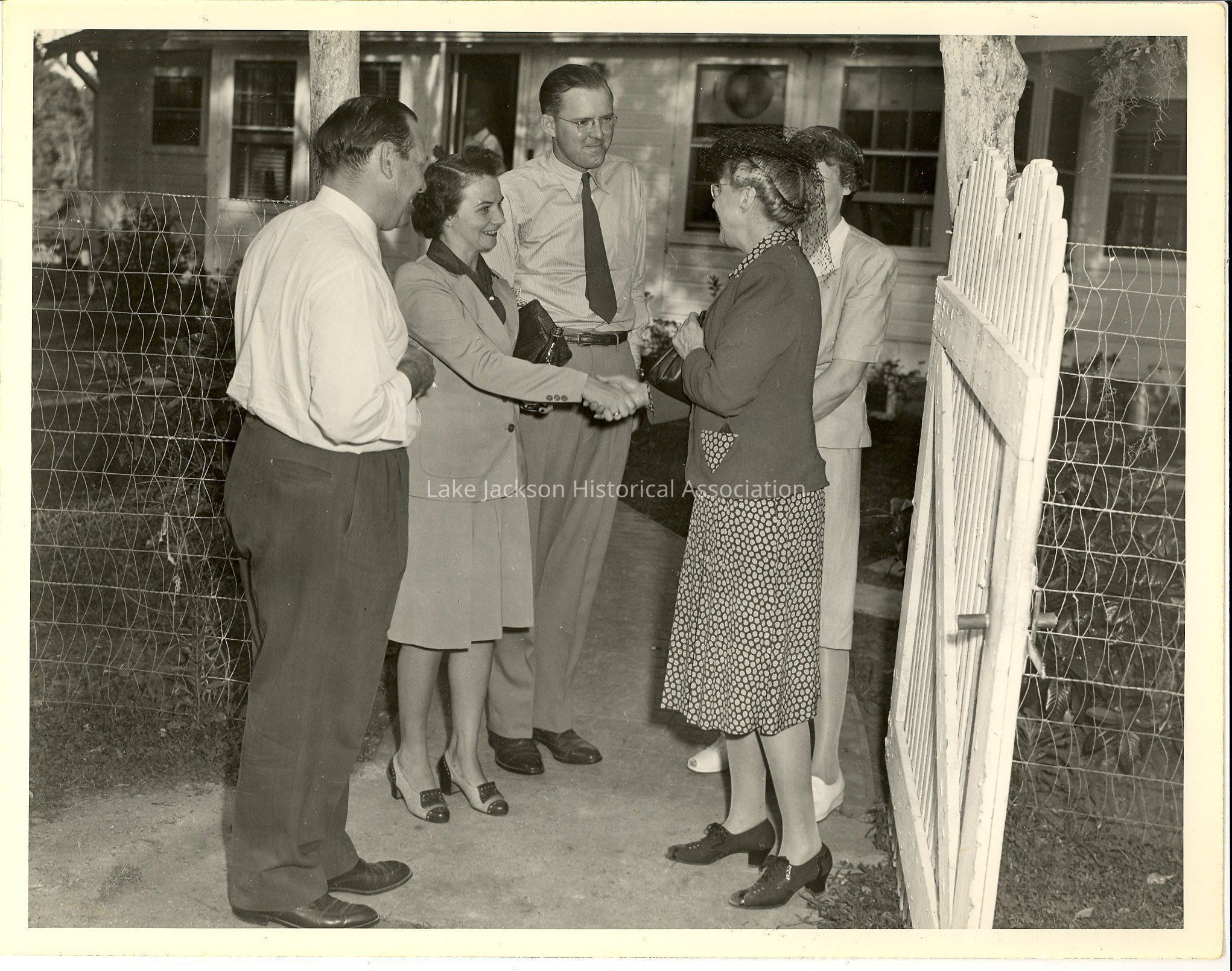 A black and white photo of a gathering at Dr. Beutel's home in Lake Jackson. Guests include personnel from Dow Midland, Michigan and Dow Texas Division. Photo includes Mrs. Barstow.Collection