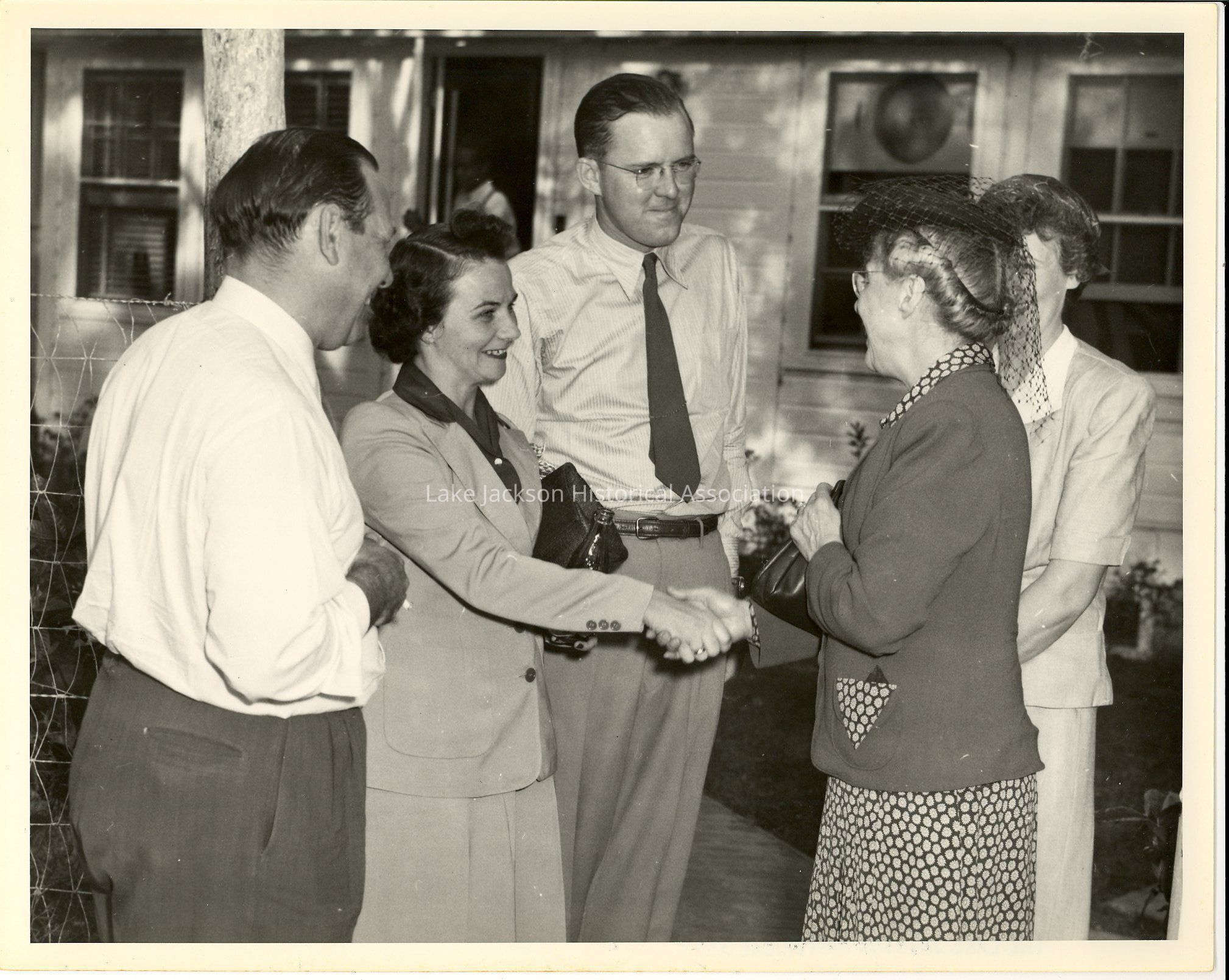 A black and white photo of a gathering at Dr. Beutel's home in Lake Jackson. Guests include personnel from Dow Midland, Michigan and Dow Texas Division. Photo includes Mrs. Barstow.Collection