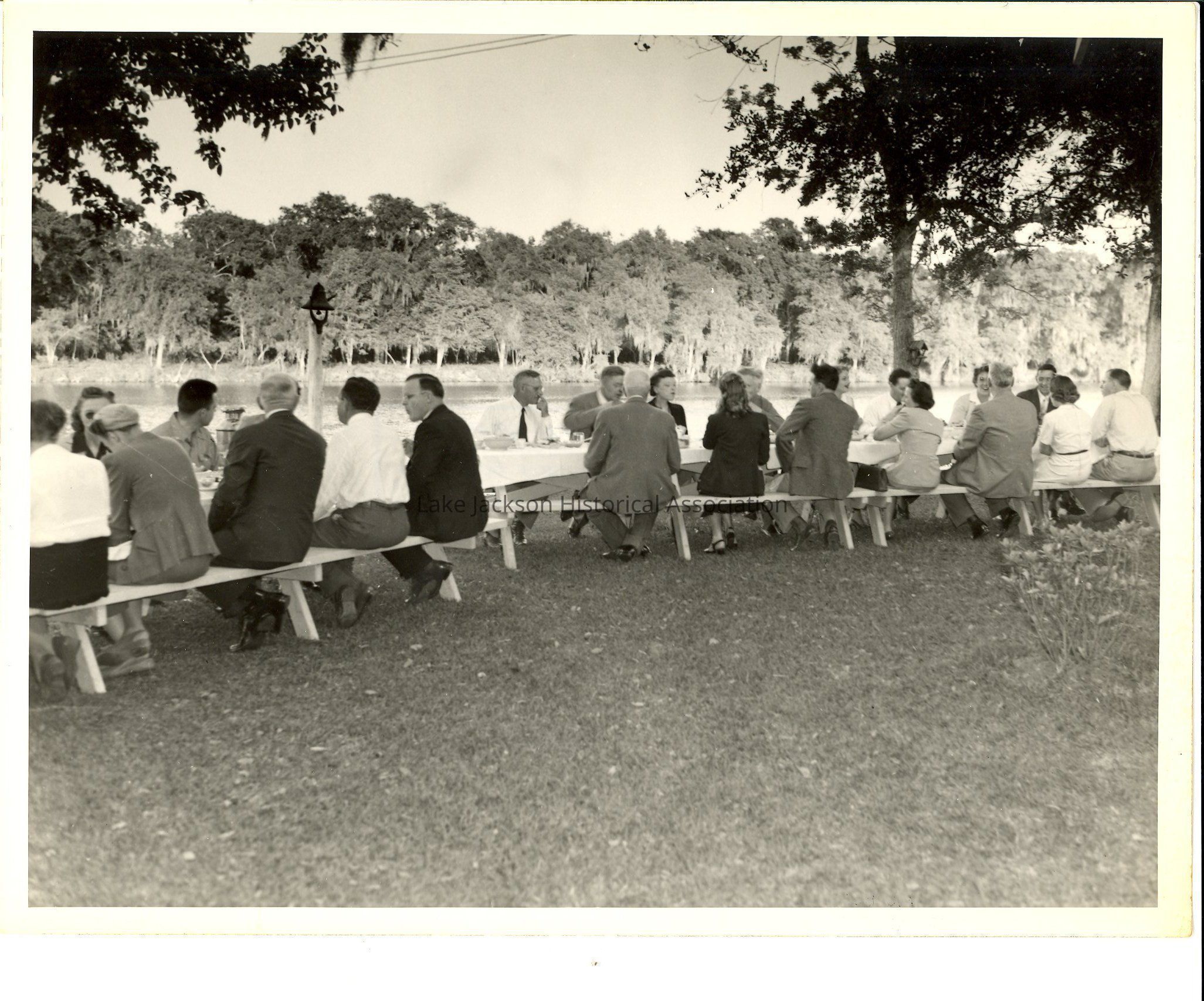 A black and white photo of a gathering at Dr. Beutel's home in Lake Jackson. Guests include personnel from Dow Midland, Michigan and Dow Texas Division. Photo includes Dr. Beutel, Mark Putnam, Willard Dow, Gretchen Bryan, and J.P. Bryan.Collection