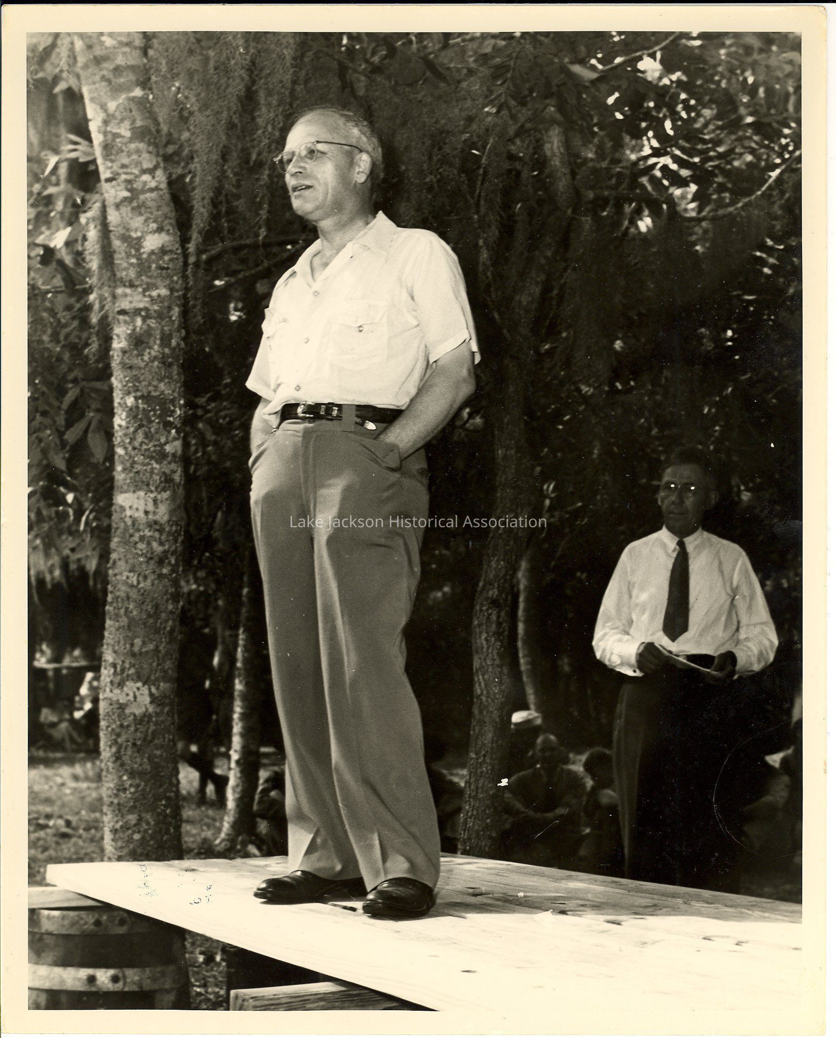 Black and white photo of Dr. Beutel addressing a crowd at a parkCollection