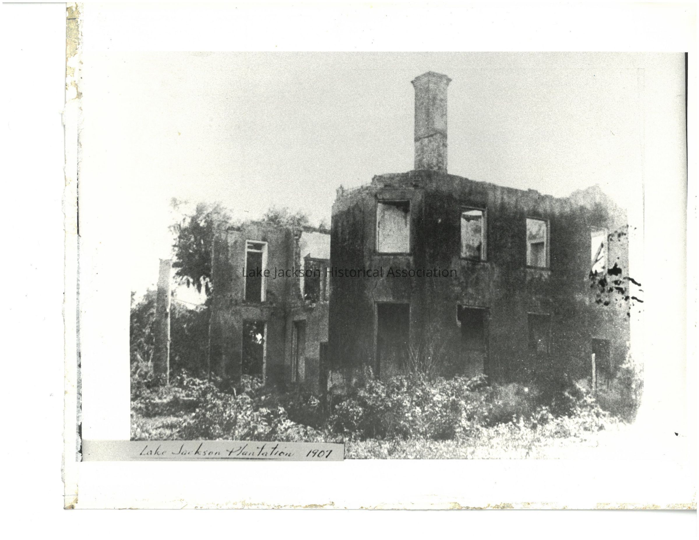 Plantation House owned by Abner Jackson. The photograph shows the damage to the house from the 1900 hurricane. Written below it is "Lake Jackson Plantation 1907".Collection