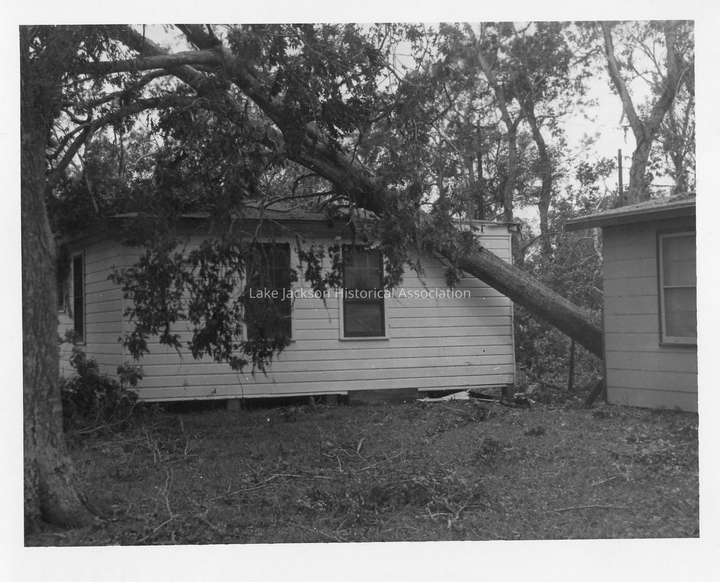 Black and white photo of the damage to a duplex in Lake Jackson after Hurricane Carla.Collection