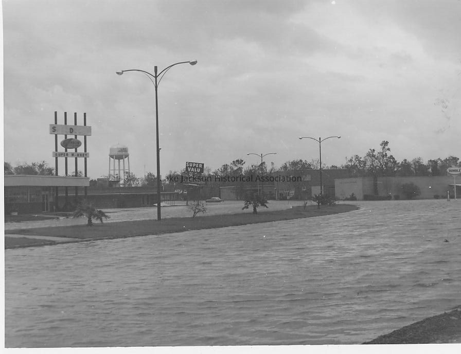Black and white photo of Shaddock 's grocery on the corner of This Way and Parking Way after Hurricane Carla. A Supervalue store, a car, telephone office, post office, Lake Jackson State Bank, and Humble Service Station are across the street from the bank.Collection
