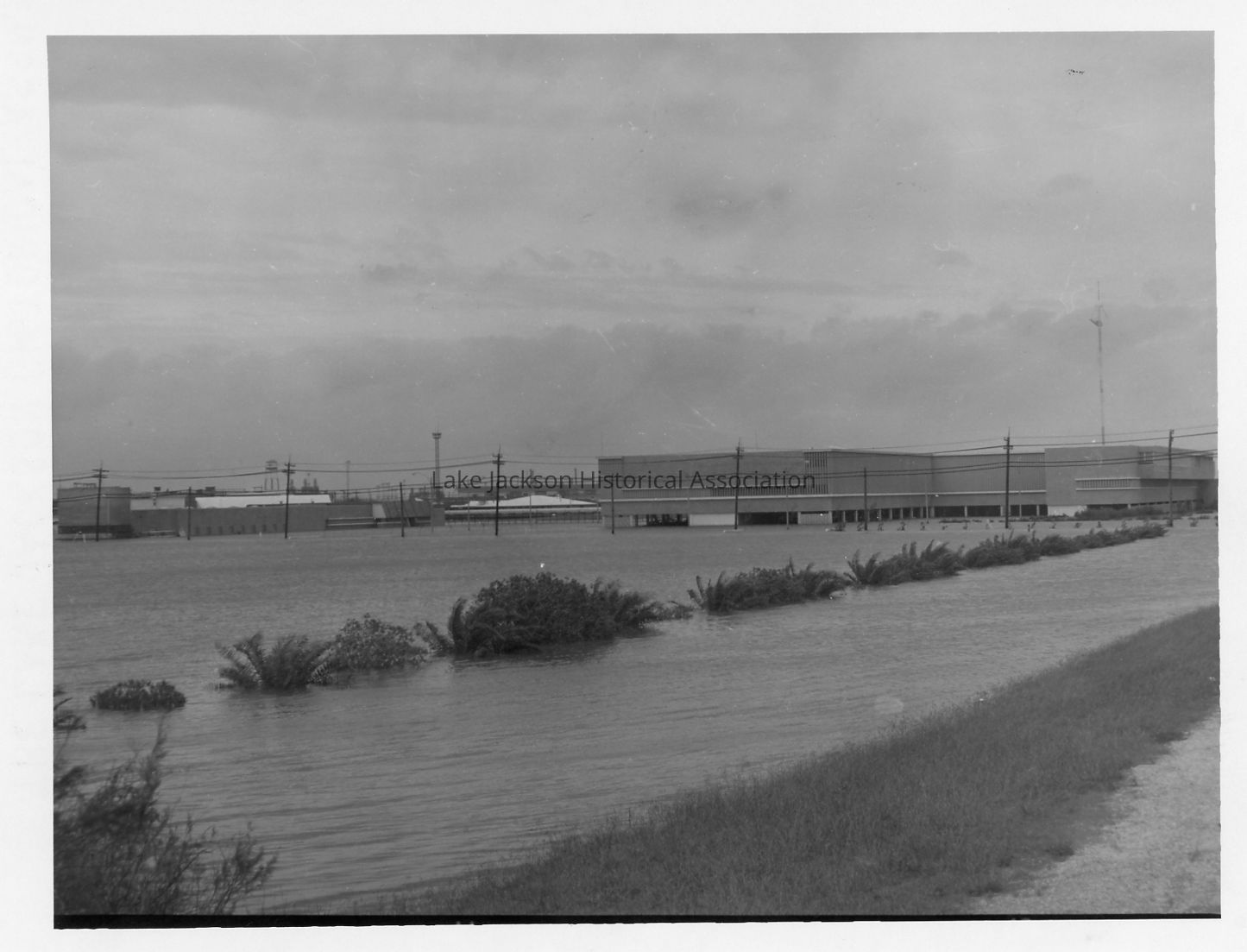 Black and white photo of the A. P. Beutel at Dow after hurricane Carla.Collection