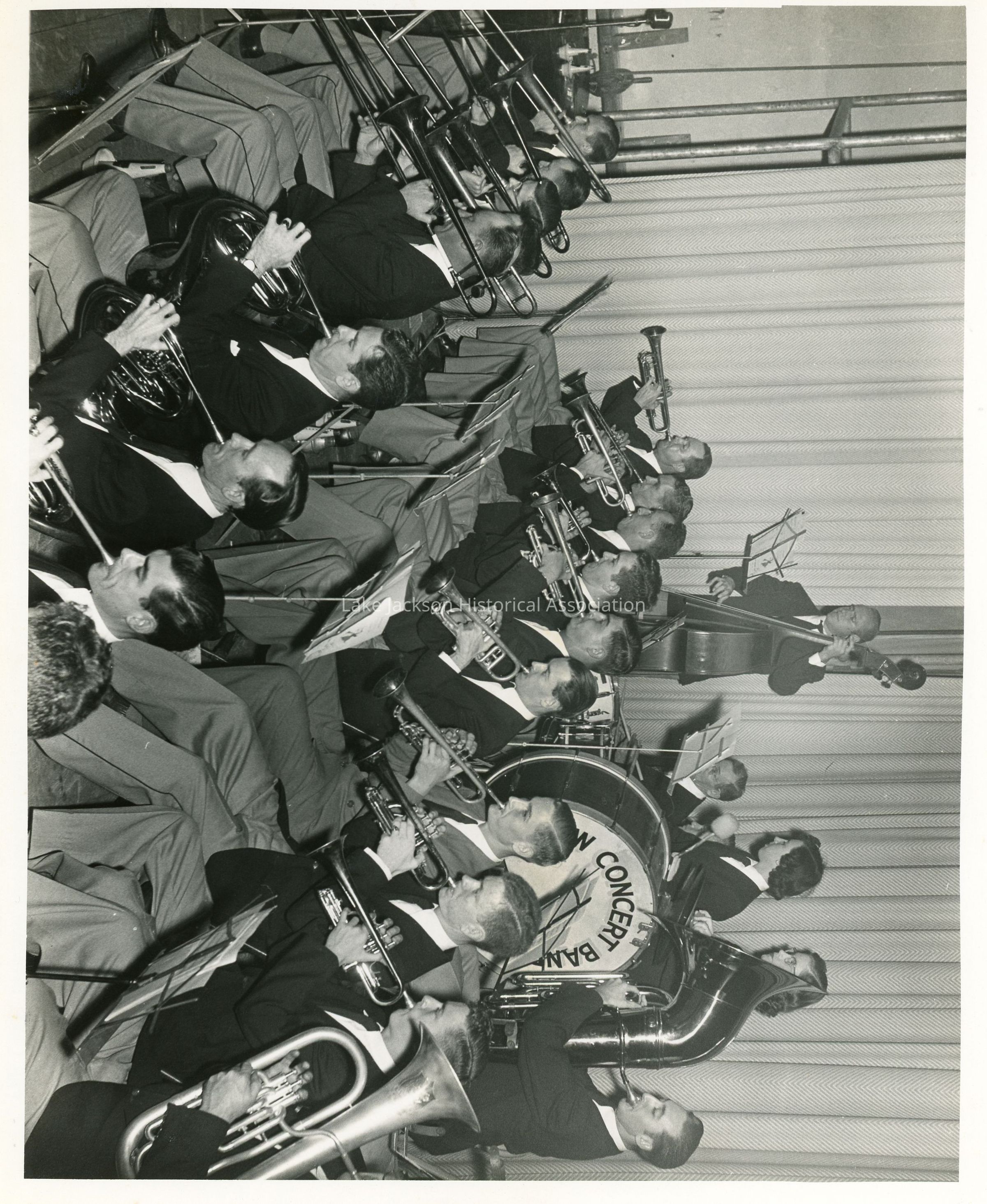 A black and white photo of the Dow Band in concert.