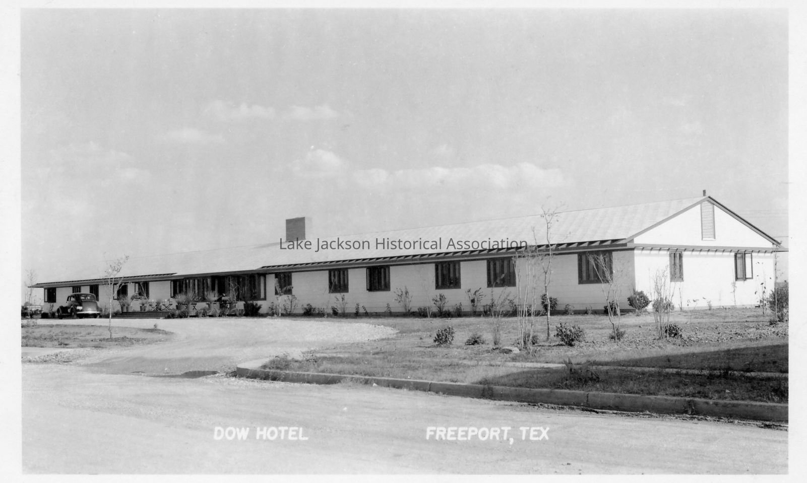 Black and white postcard of the Dow Hotel in Freeport, Texas in 1946.