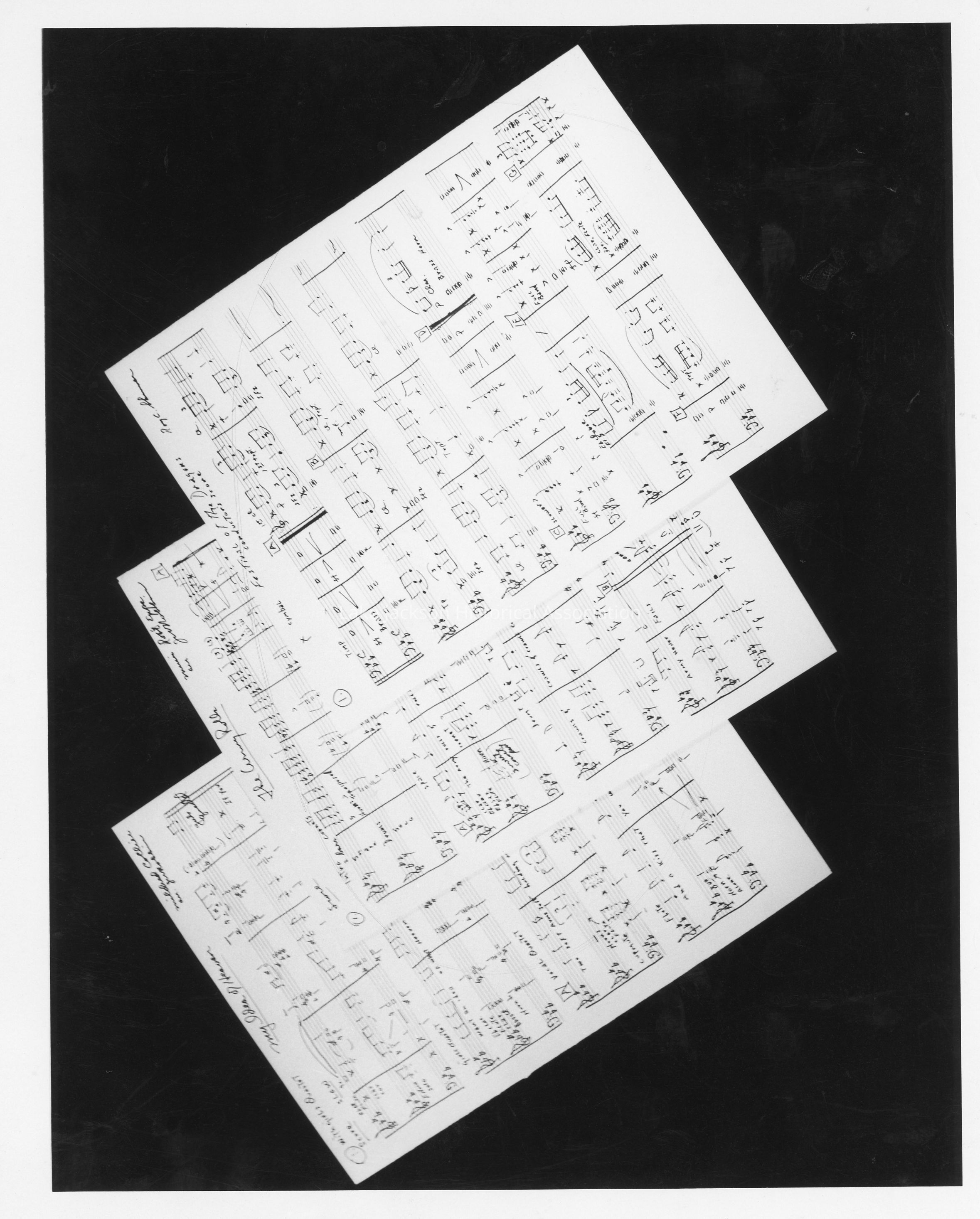 A black and white photo of 3 sheets of music used by the Dow Community Band.