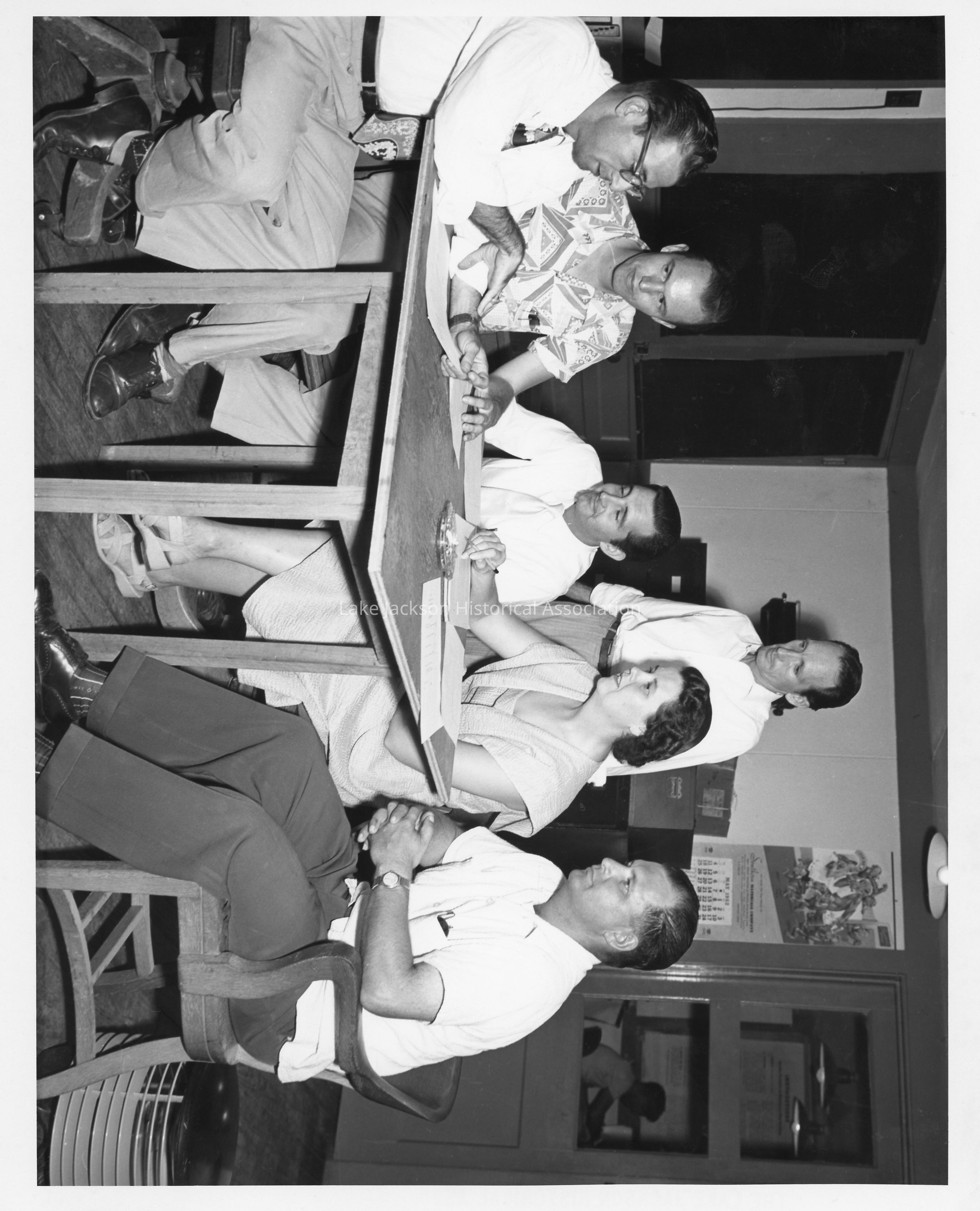 A black and white photo of a planning session of some members of the Dow Community Band on 06/03/1952, includes Bryan Cooney, Phil DiGuardi, Al Baker, Johnny Robbins, Elaine Newcombe, and unidentified man.Collection