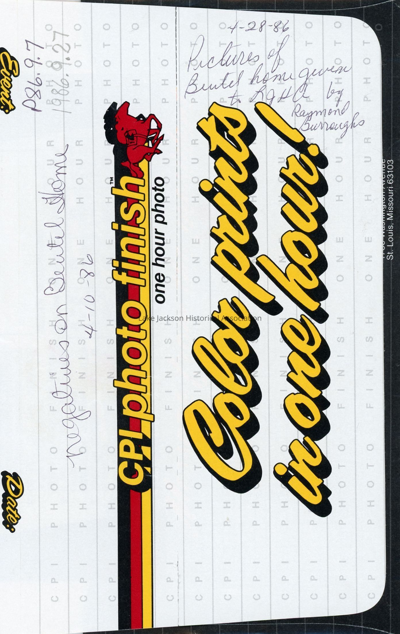 Photo of envelope of color negatives of Dr. A.P. and Belle Beutel home on Lake Jackson.