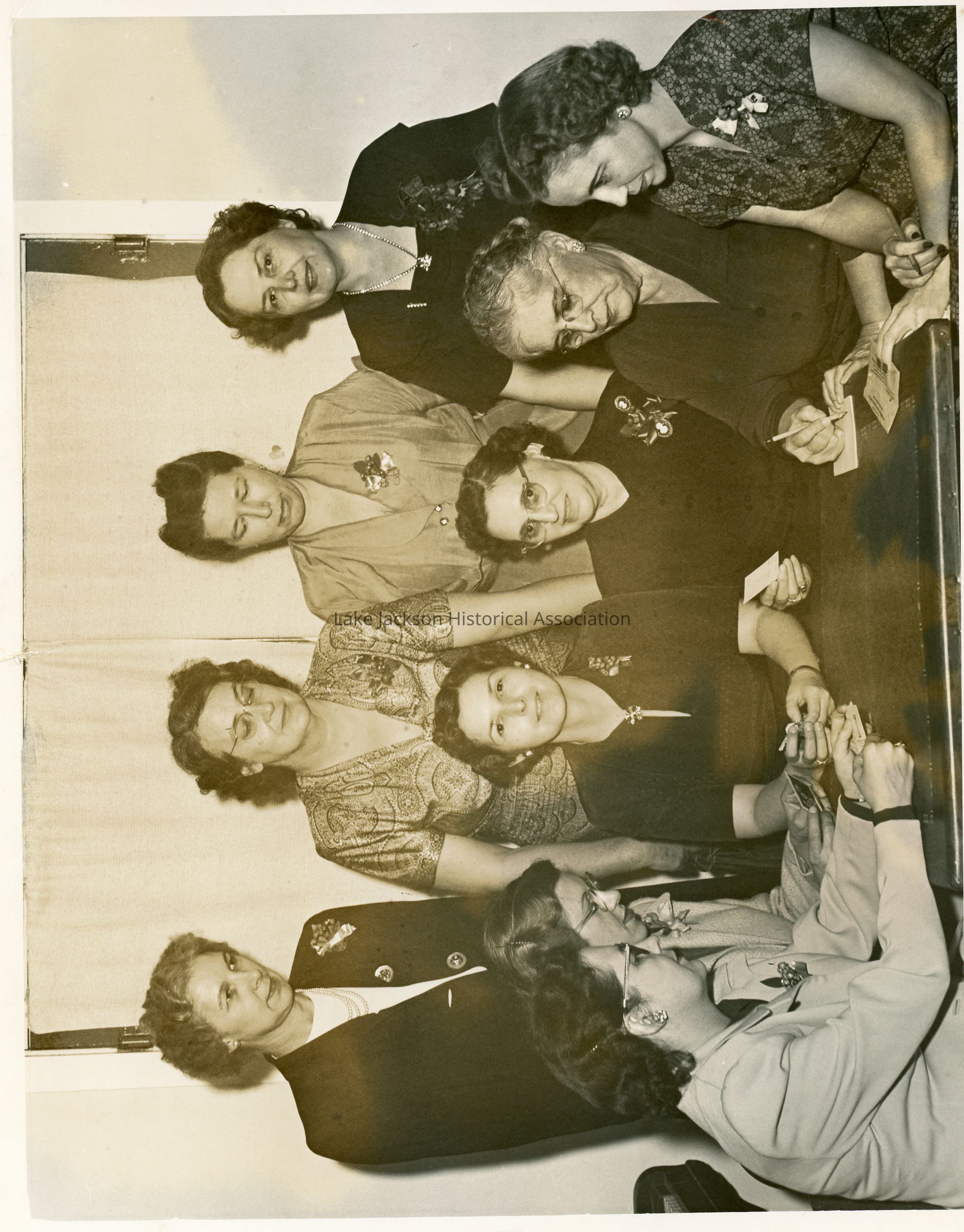 A black and white photo of Lake Jackson's Home Demonstration Club. Photo includes Edith Slife, Olive Medley, Velda Davis, Bunny Grey, Helen Smith, Eloise Little, Lillian Von Eddleman, Lenora Mitchell.Collection