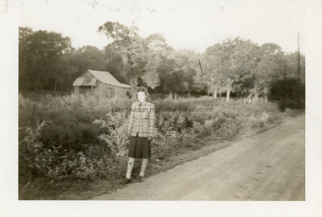 Photo of Georgia Walley walking down Oyster Creek Dr. across from present day Arlans grocery store.