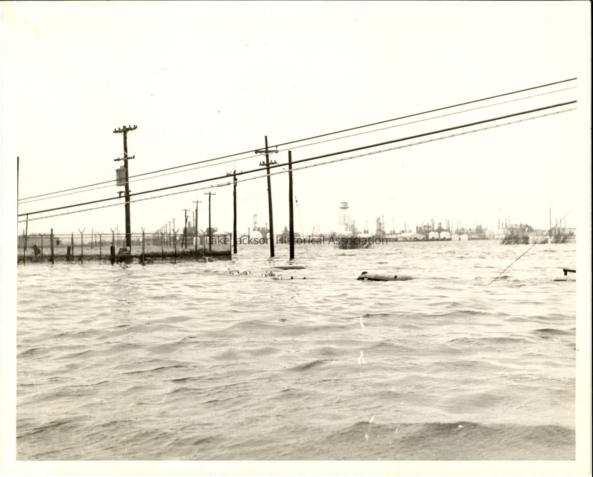 A black and white photograph of Plant A flooding by Carla. In the foreground are the flood waters and some telephone poles and in the background is Plant A. Stamped on the back is "Pat O'Connell/ Photography/ 55 Lantana Ct./ Lake Jackson, Texas" and stamped below it is "Sep 12 1961".Collection