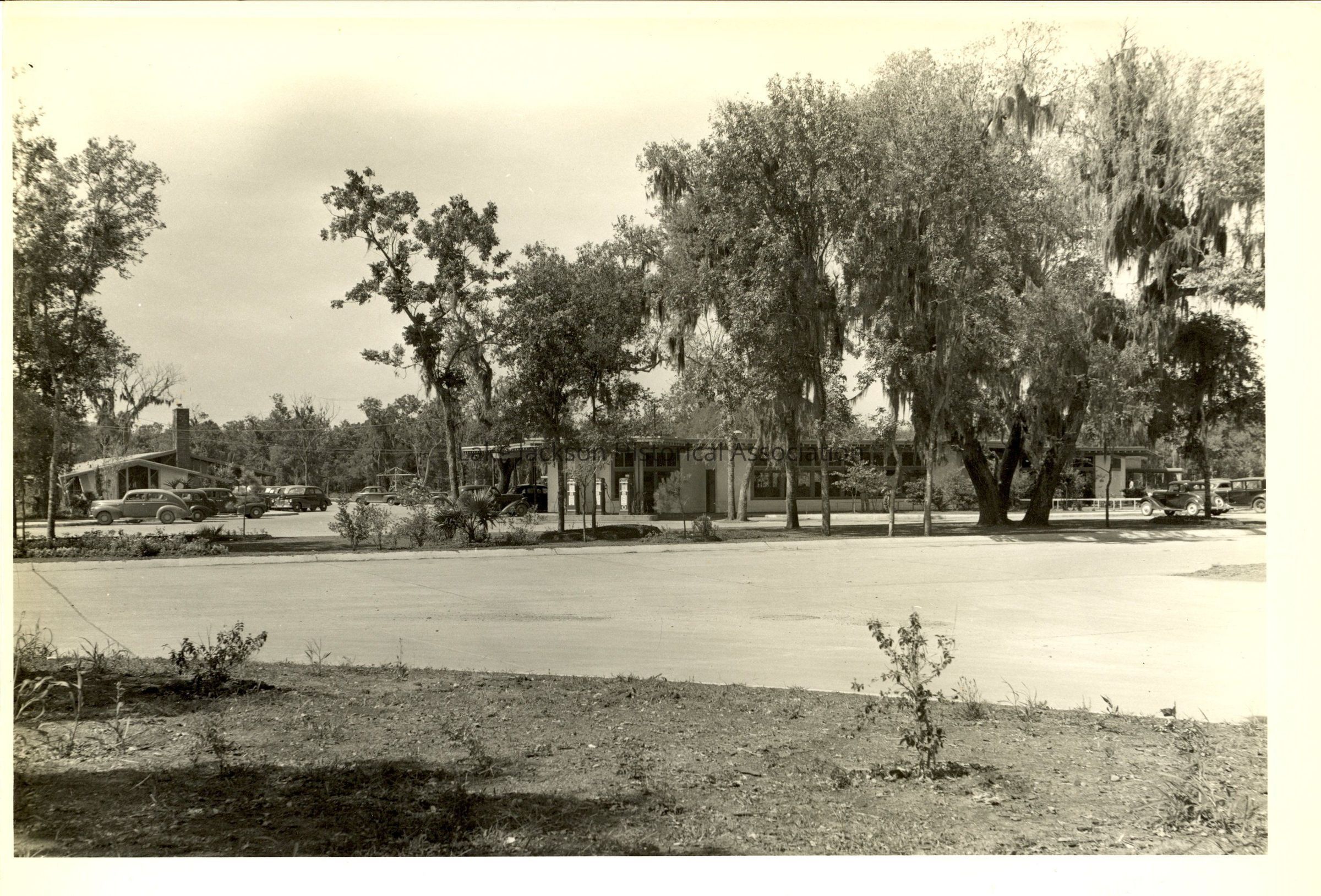 Black and white photograph of Carriage Square South Parking Place Lake Jackson. At the left is the Alden Dow Office Building and in the center is Schmidt's Service Station and Lake Drug.Collection