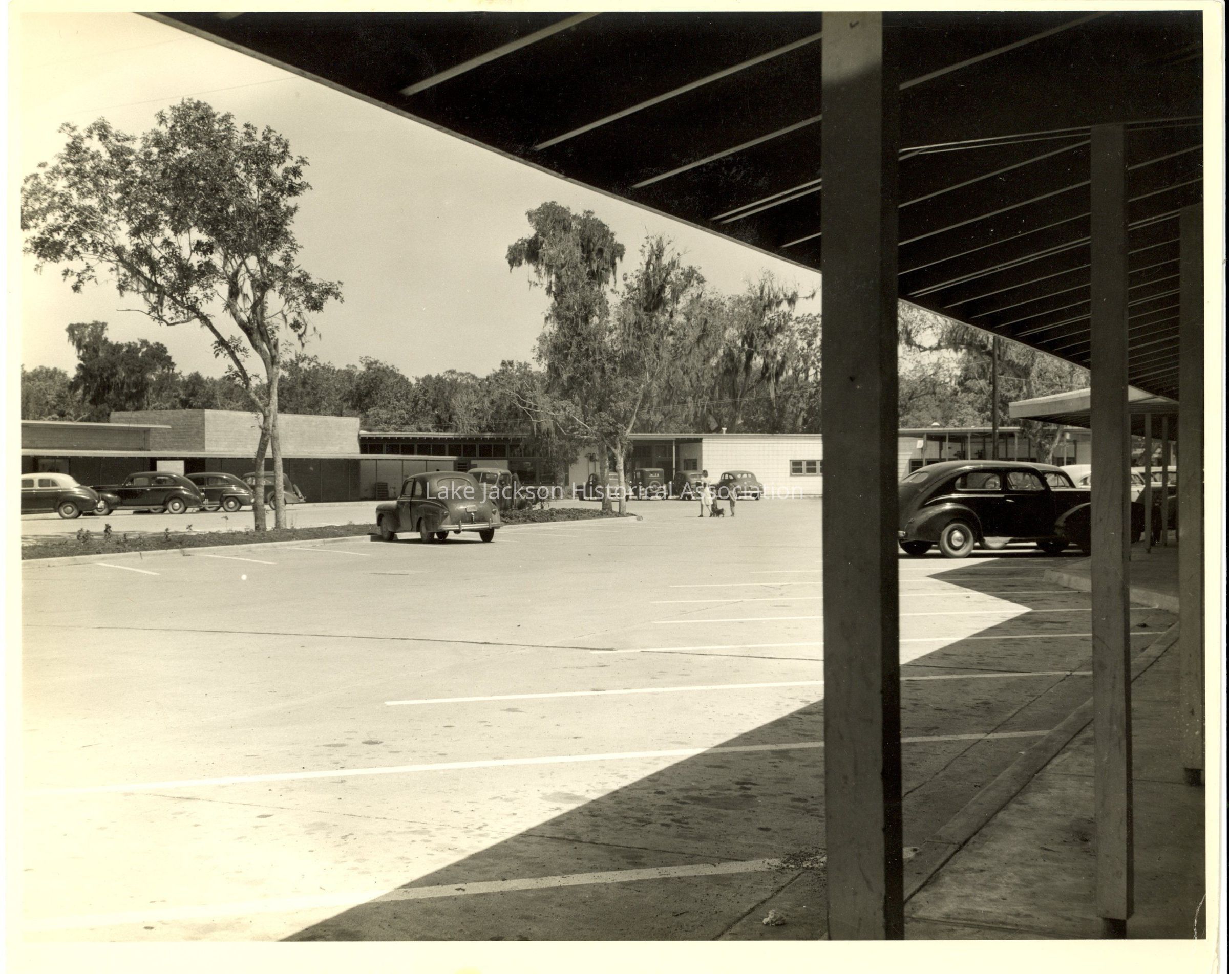 Photo of street scene at South Parking Place Lake Drug. The photograph shows the vehicles on the parking lot and a lady and two small children walking to a business and is taken from underneath an awning.Collection