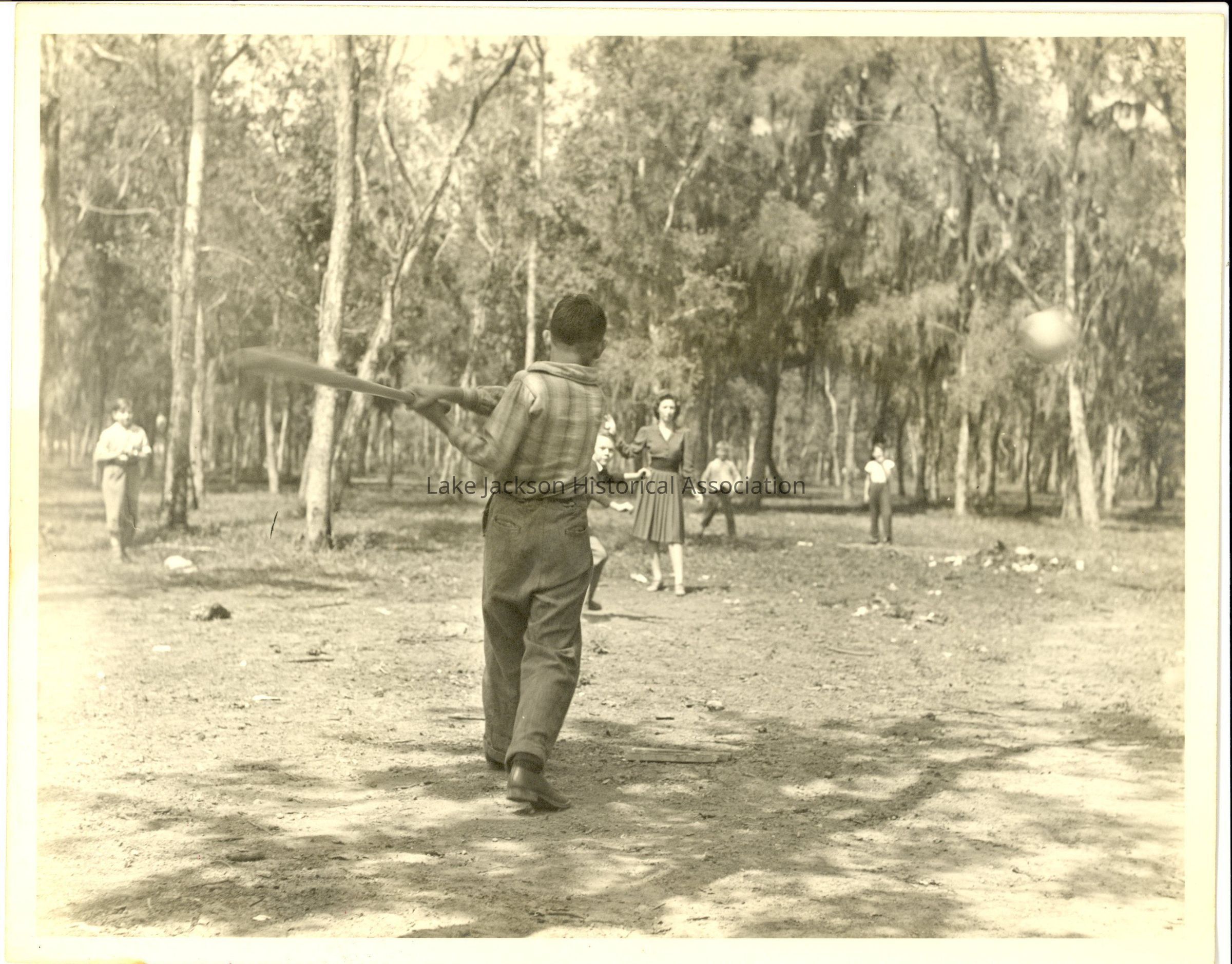 Black and white photograph of recess at the elementary school in 1943. The students are playing baseball and the batter has swung and missed the ball (the ball can be seen at the right). In the center of the picture is the teacher with two fingers up, indicating two strikes. In the picture is the pitcher (partially obscured by the batter) and three more boys in the background. Home Plate is marked by a piece of wood.Collection