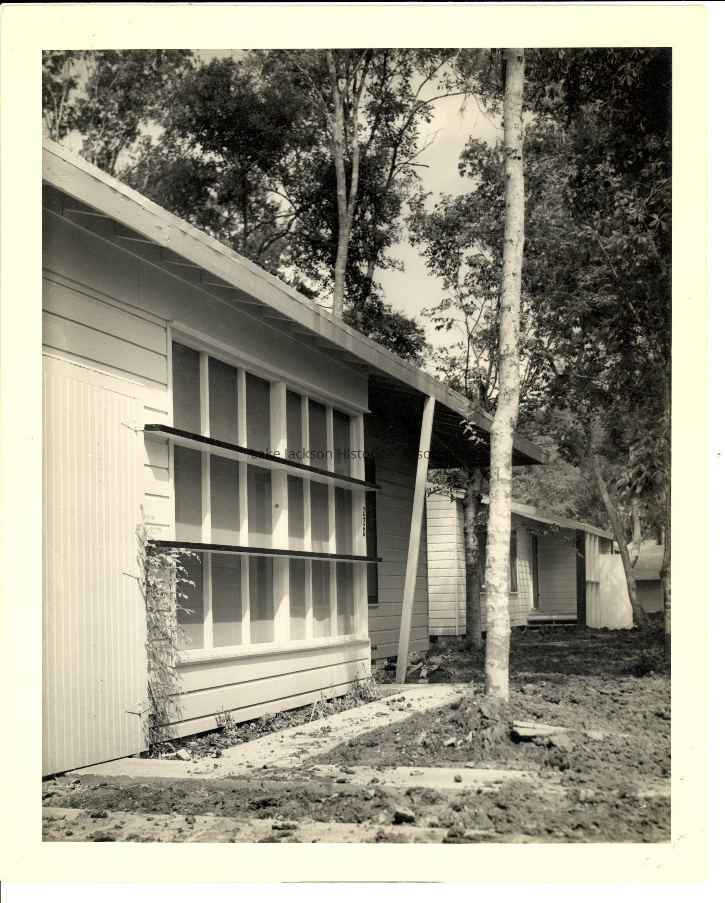 Black and white photo of 1943 house in Lake Jackson. By the window is the house number "220" and there is not any grass in the front, only dried mud. There is dried mud on the walk from the driveway to the front door.Collection