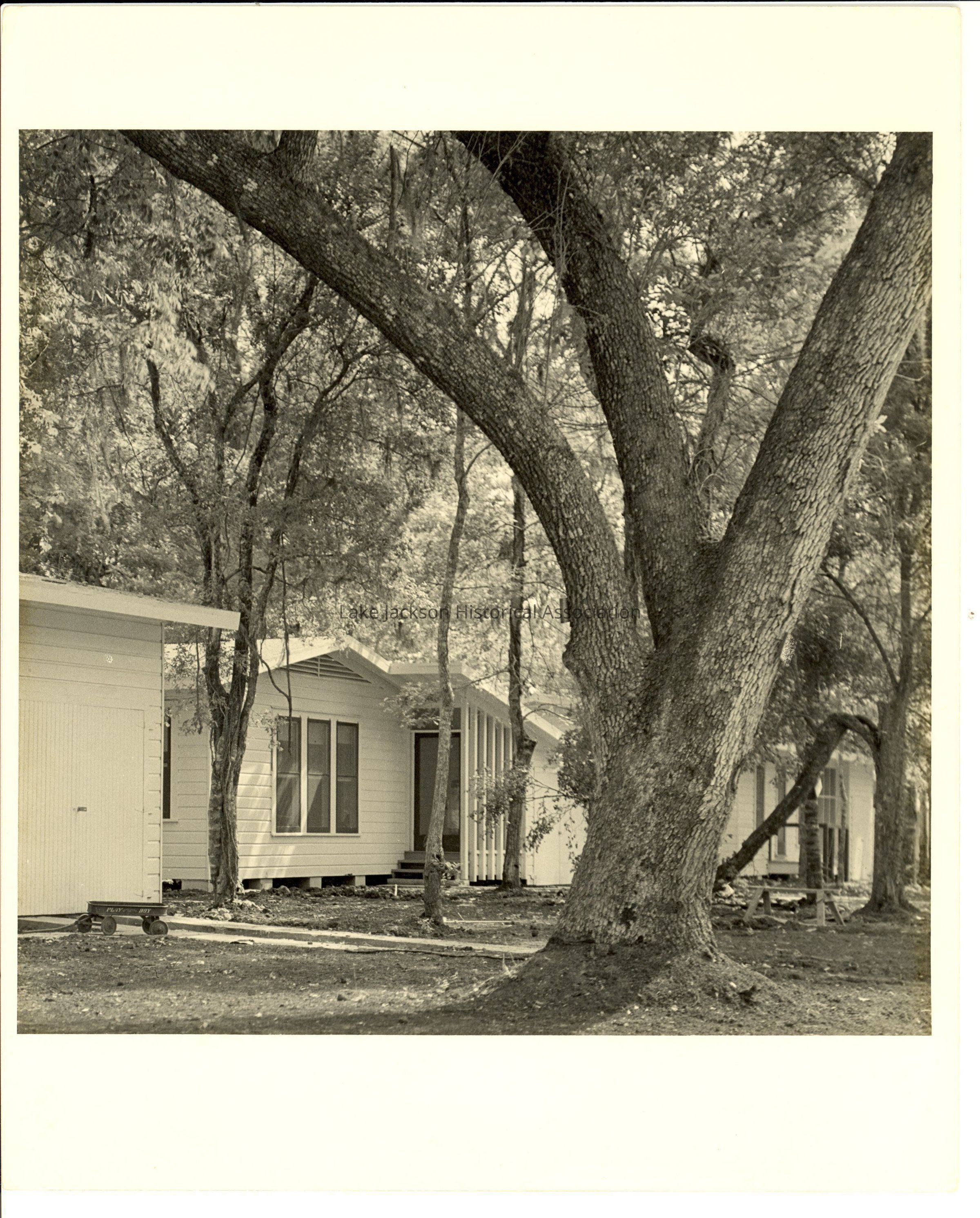 1- Photo of 1943 house in Lake Jackson with big tree. The house is on cement blocks and has a garage to the left of the house. In front of the garage is a Play Boy wagon. In the front yard of the house is a sawhorse. The photograph is printed on an 8x10 sheet of paper but the actual size of the picture is 7.5x7.75 with a white border around the picture filling in the sheet of paper.Collection