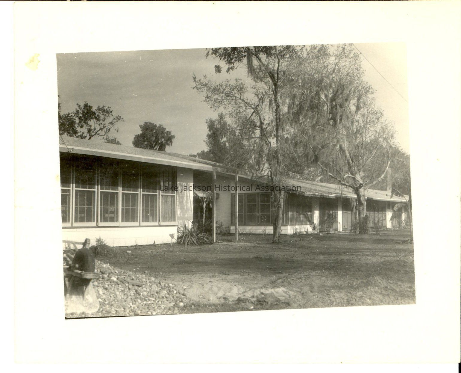 1- Black and white photo of back of Alden Dow Office, City hall, and first business building. Located on South Parking Place. Breezeway is also visible. Wheel barrow in bottom right of photo indicates it may have been during the final construction phase of landscaping around the building.Collection