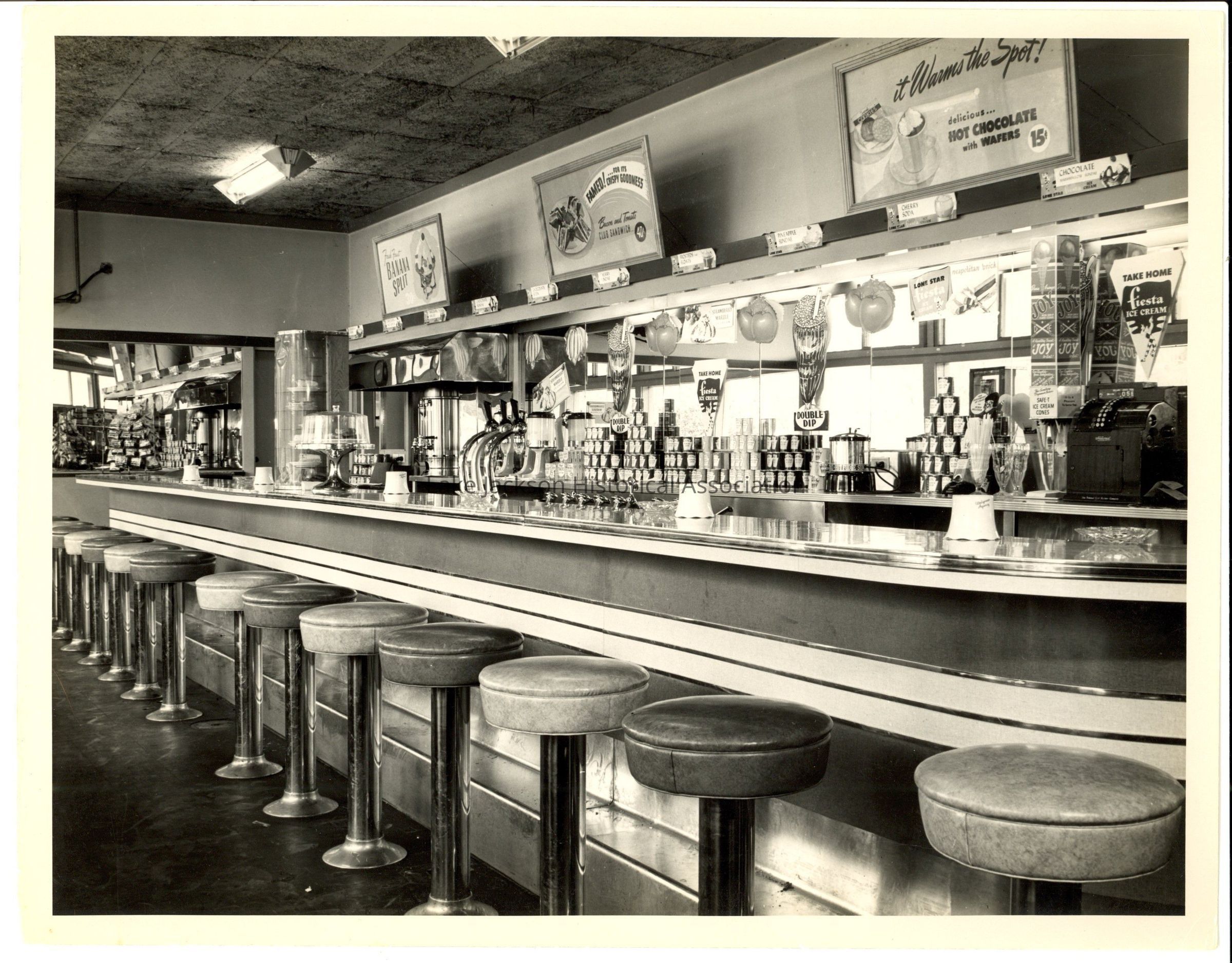 1- Black and White photo of the front of Lake Dug's fountain area. At the counter is a row of stools and on top of the counter to the left is a pie case. Behind the counter along the back wall is a mirror and a small counter with the cash register to the right and stacks of cans to the left of the register.Collection