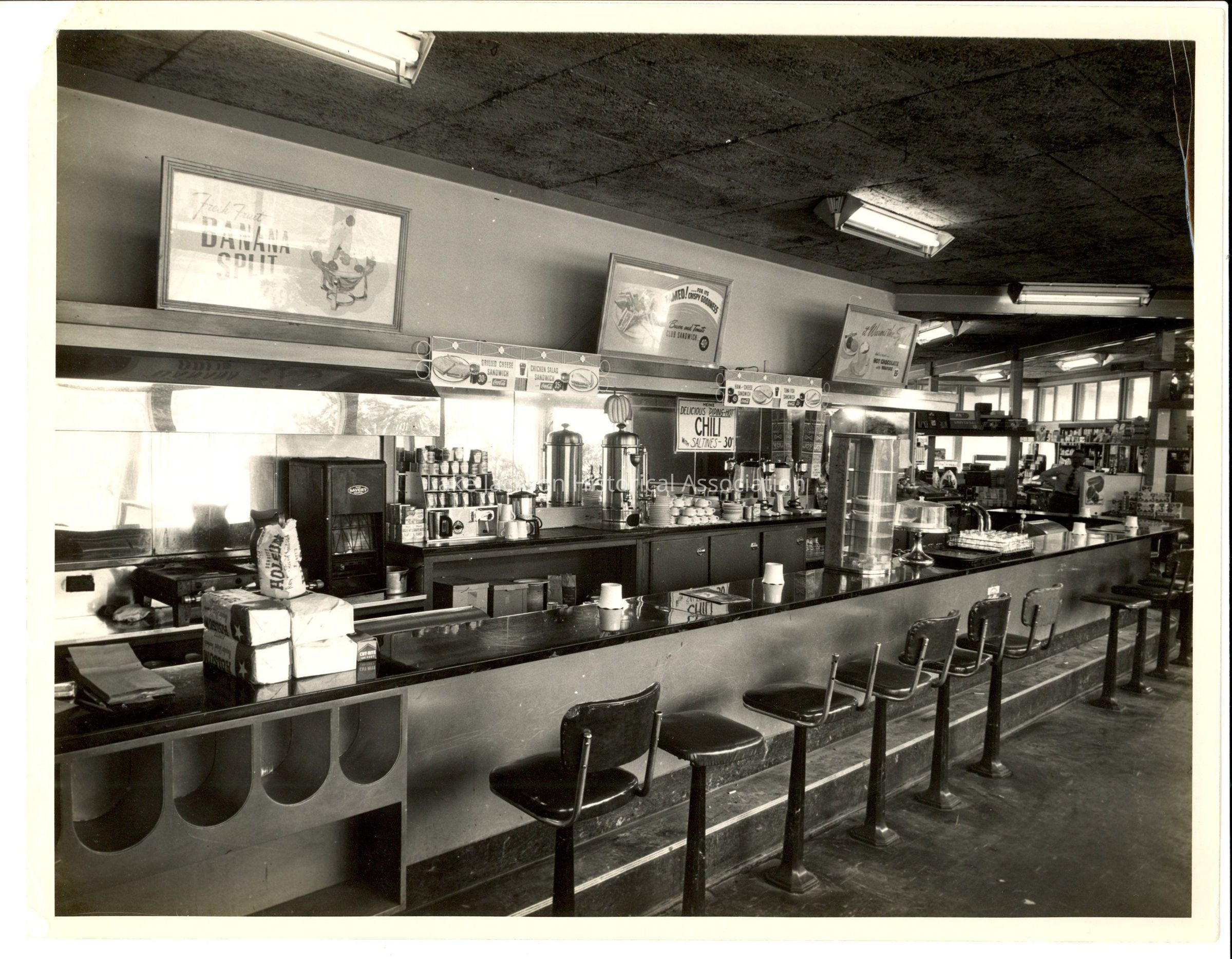 1- Black and white photograph of the Lake Drug counter with chairs, three of the chairs do not have backs. A man is standing in the background. Stamped on the back is "Texas Division/ The Dow Chemical Company/ Freeport, Texas/ Photograph" and below it is stamped "Photo by/ Mike O'Connell". The white border of the photograph has been torn in the upper left cornerCollection