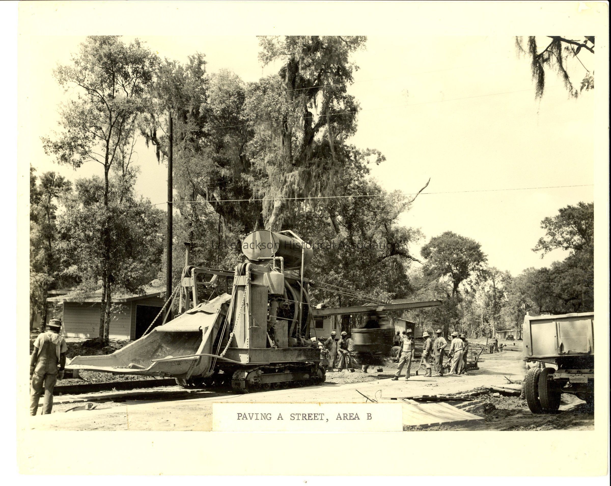 1- Black and white photo of paving a street Area B. The street is being paved using a street paving machine and workers are standing nearby with shovels. Taped at the bottom of the photograph is a white label which reads "Paving a street, area B". In the corners are small holes where the photograph was pinned to a wall. On the back written in ink is "Paving St. 1943".Collection