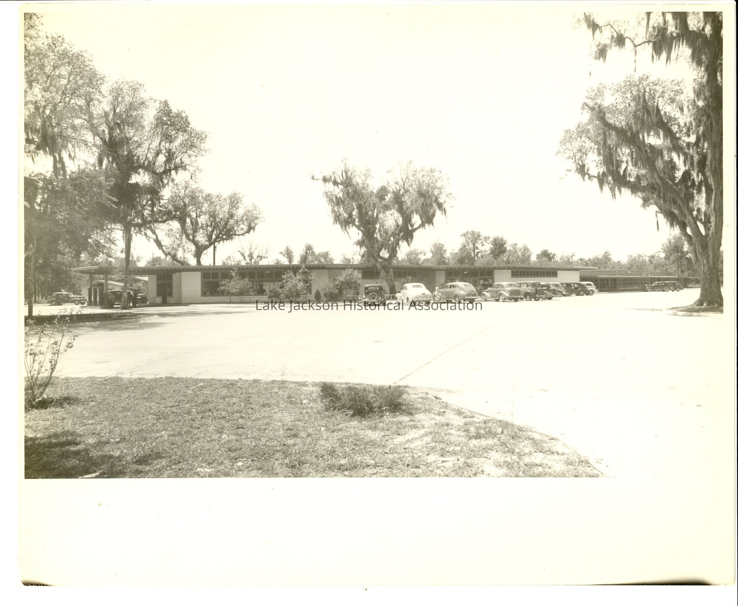 Black and white photograph of early business view of S. Parking Place in Lake Jackson. At the left side of the photograph is Scmidt's Service Station then Lake Drug and the Piggly Wiggly. In the background at the left is the Alden Dow Office building. There are several cars in the parking lot. Stamped on the back is "Photographs by/ Earl R. Gilbert/ Houston 9, Texas".Collection