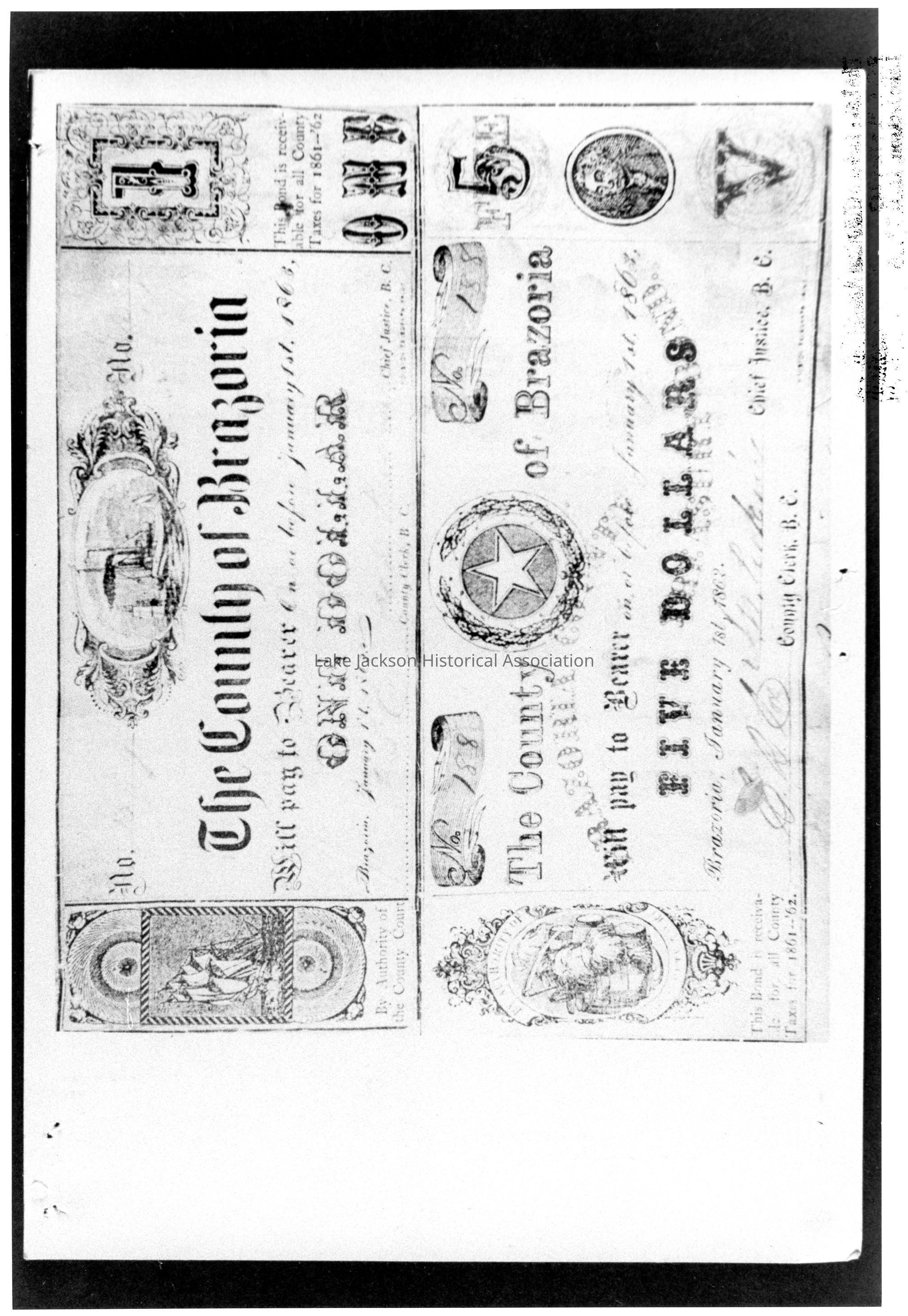 8 x 10 black and white photo of bond for County Taxes for 1861-1862 for the amounts of one dollar and five dollars.Collection