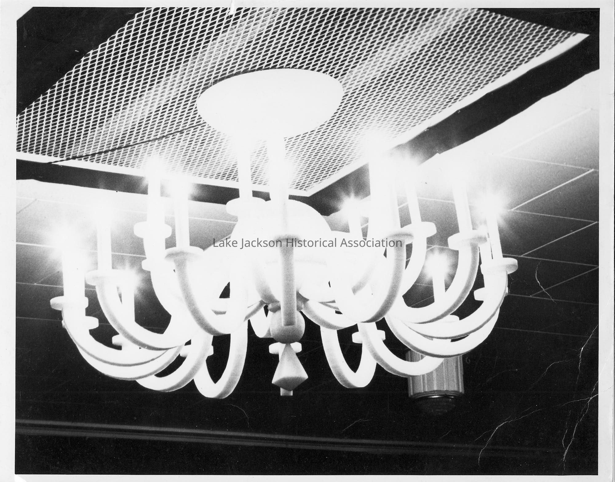 Black and white photo of a Styrofoam candelabra. The Styrene Department gave dances at the Freeport Community house. This was one of several candelabras they carved out of Styrofoam which were wired and hung from the ceiling of the Freeport, TX community house as decorations during the dances.Collection