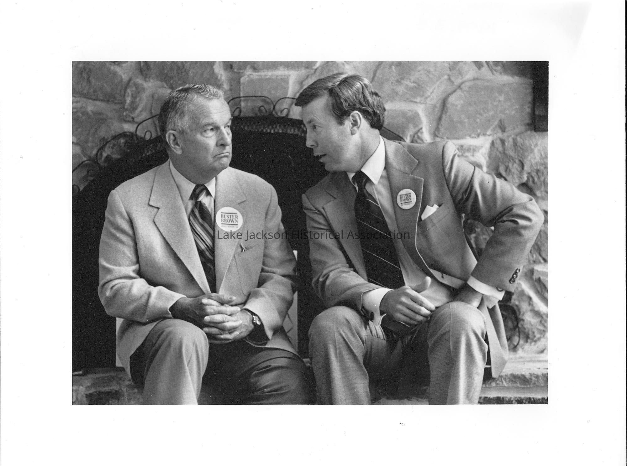 1- Black and white photo of Bill Clements and James E. "Buster" Brown in front of fireplaceCollection