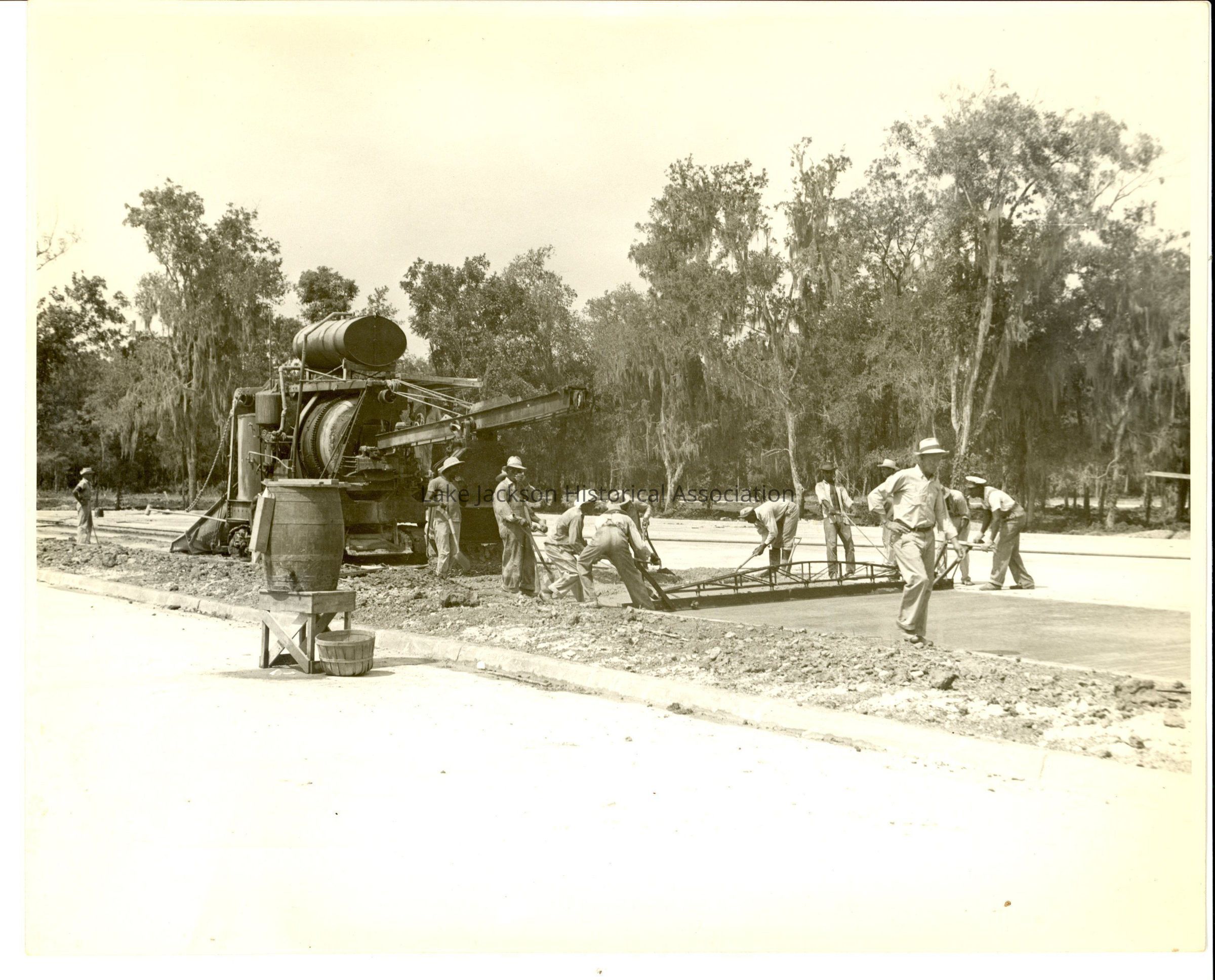 Black and white photo of workers paving Parking Way in Lake Jackson 7-18-44. There are 13 men in picture. Water barrel in left foregroundCollection