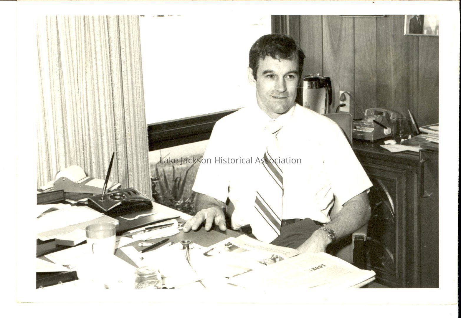 Black and white photo of Dr. Ron Paul sitting at desk