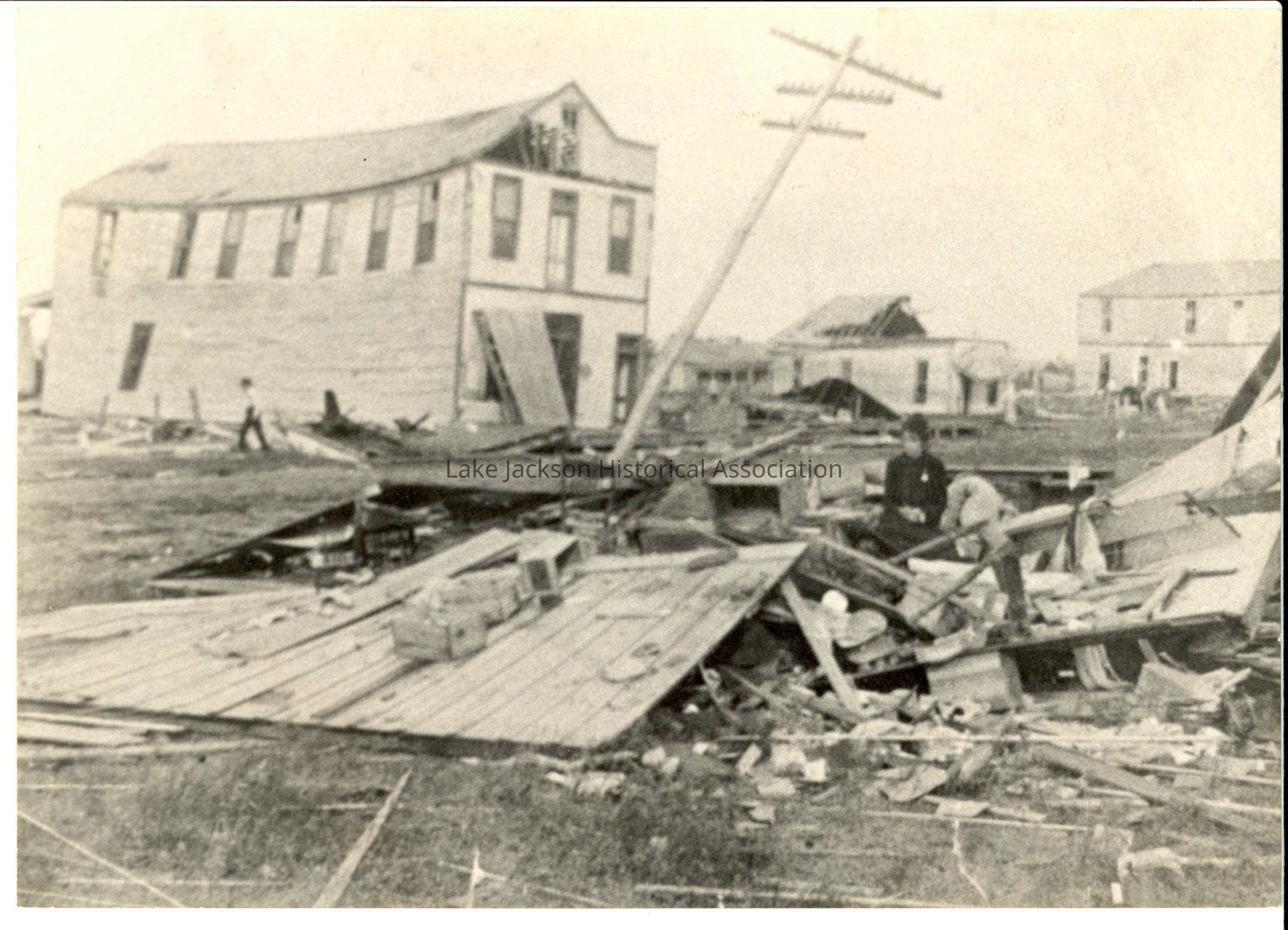 Black and white photo of a woman in house rubble after Velasco Hurricane