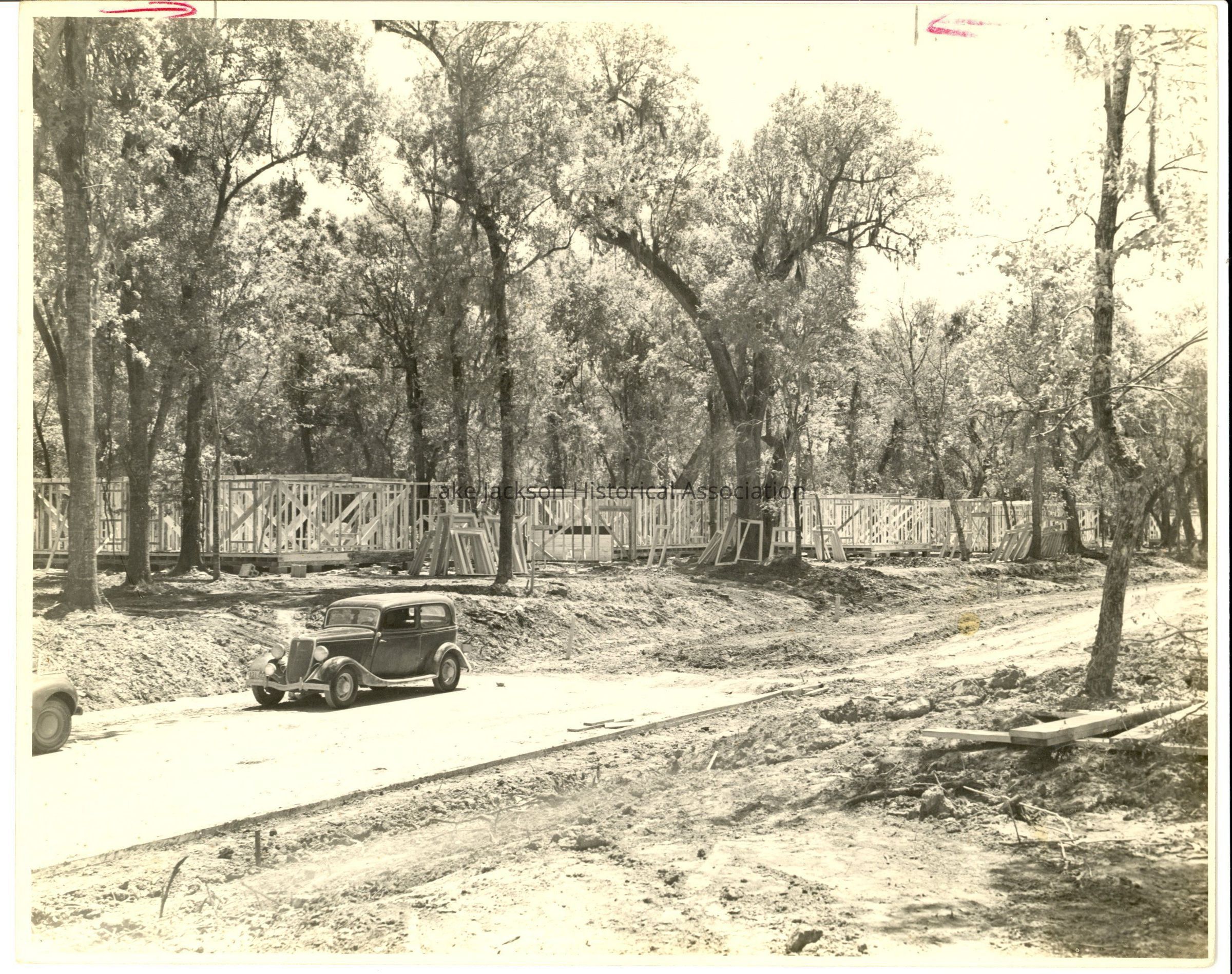 Black and white photo of construction of early dwellings in Lake JacksonCollection