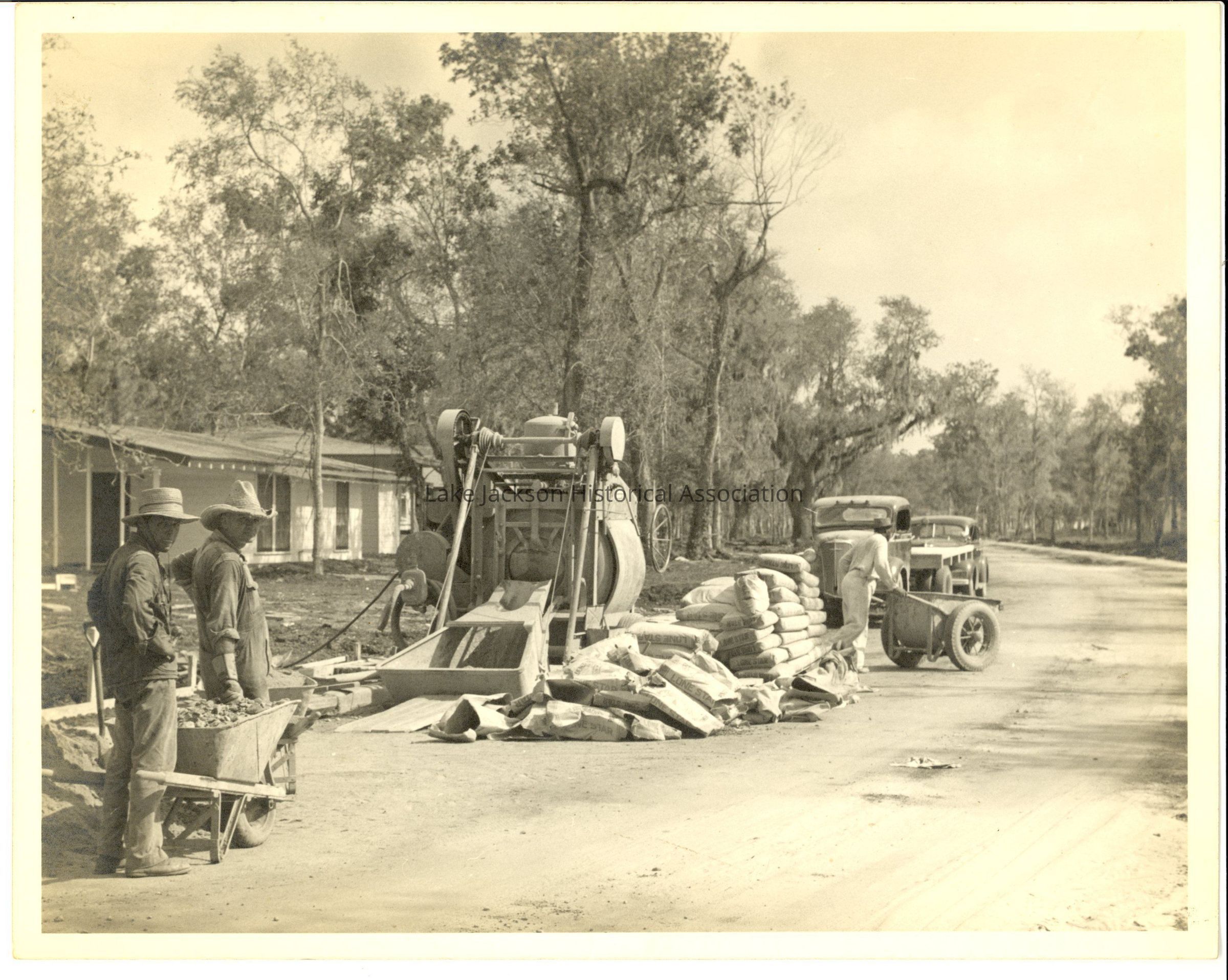 Black and white photo of men working on Winding Way Street in Lake JacksonCollection