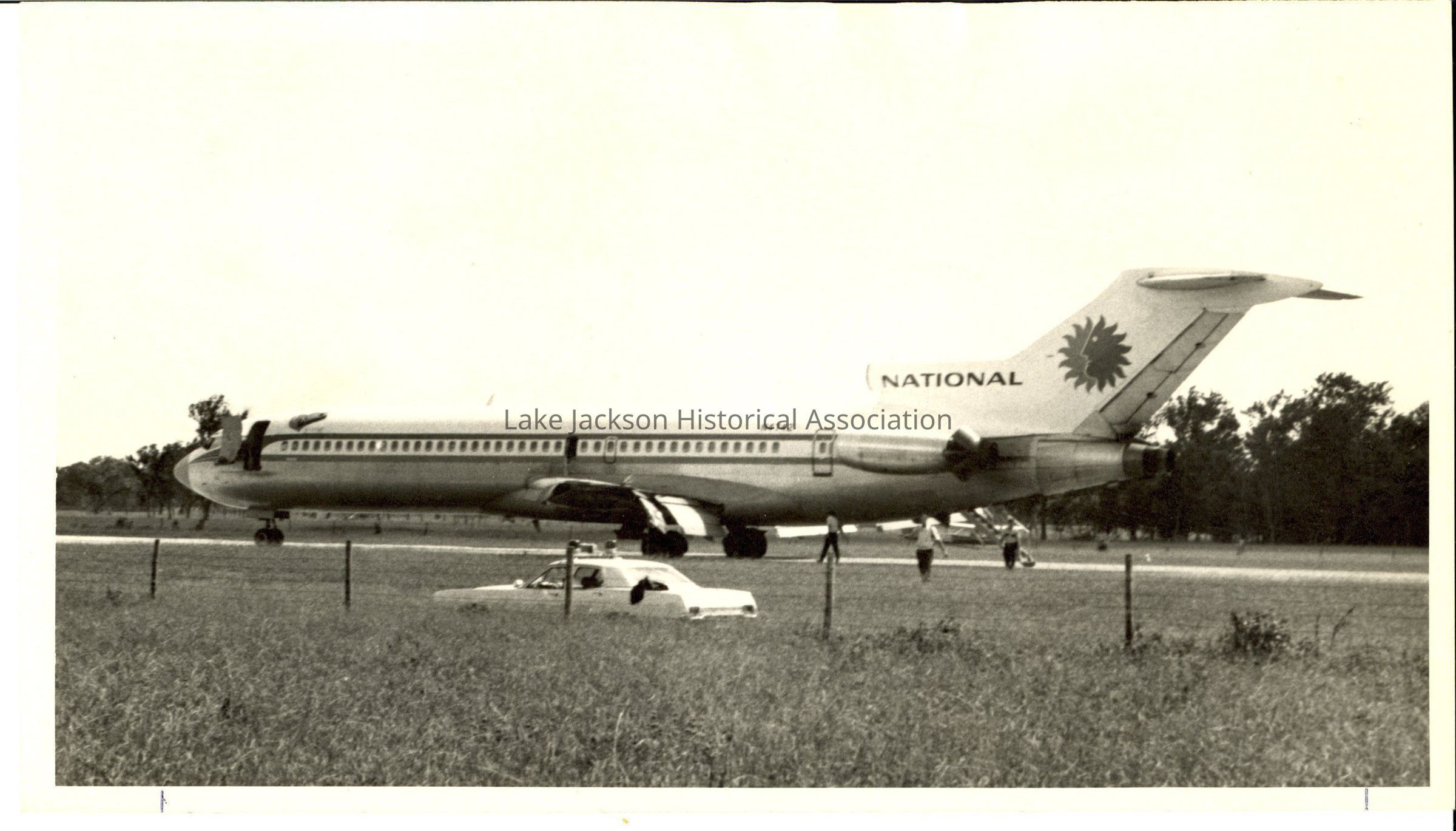 Black and White Photo of hijacked National N4742 Plane sitting on the runway with police officers around it.Collection