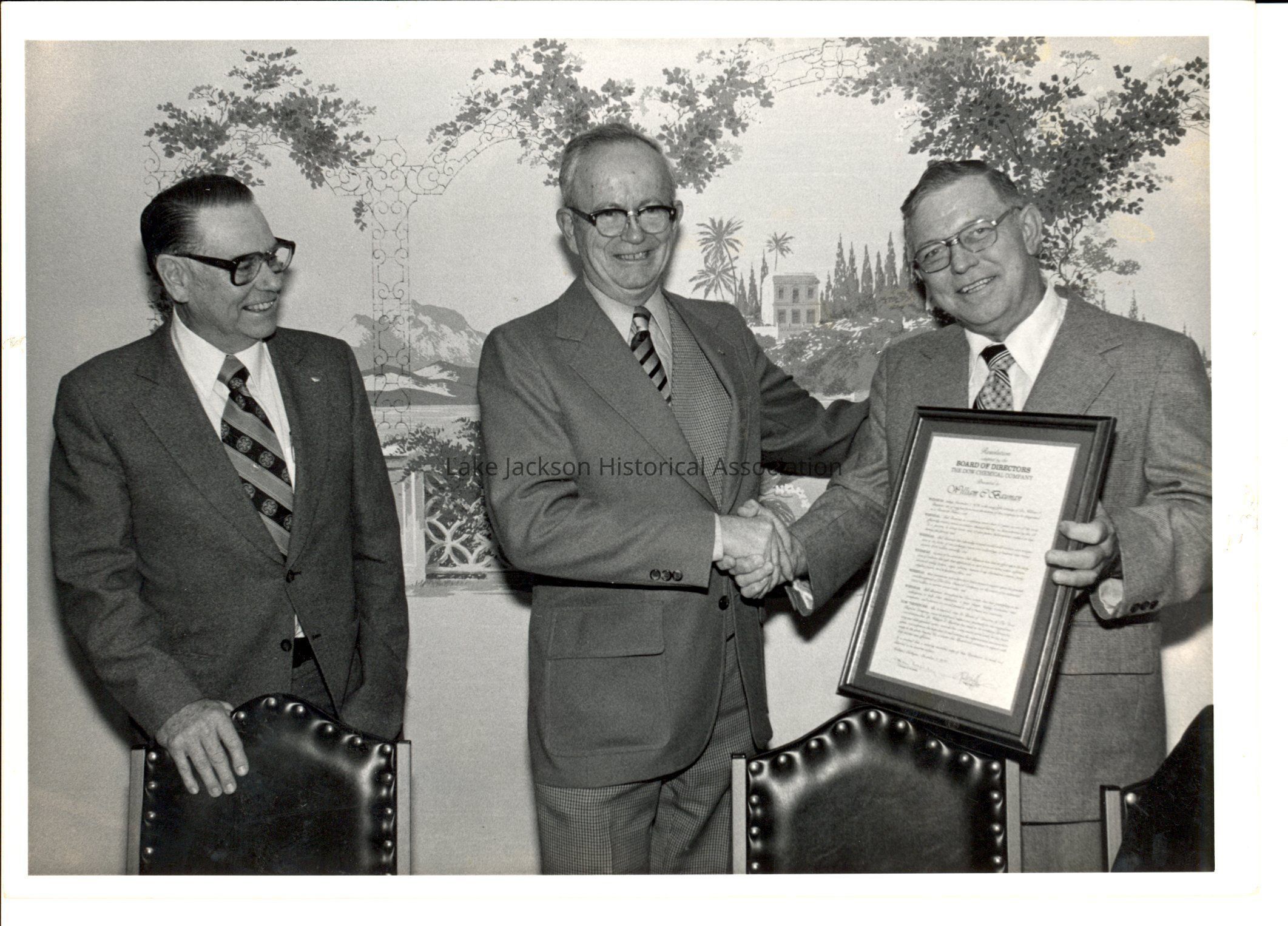 Photo of three men at a ceremony. The man on the left is H. H. (Mac) McClure, a General Manager of Dow Chemical Texas Division. On the back of the photo is a negative and a sticker - Dow Chemical U.S.A Texas DivisionCollection