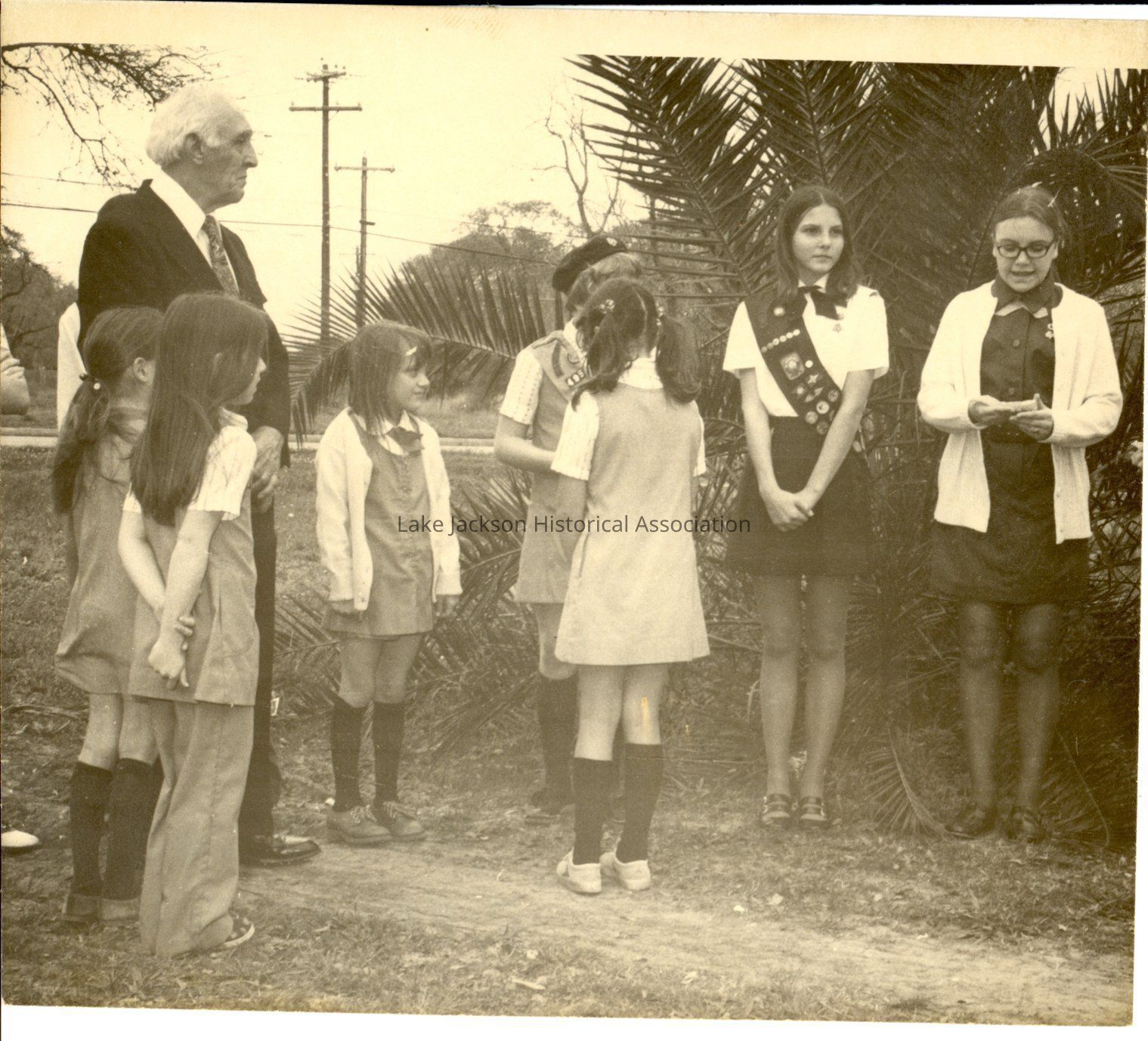 1- Black and white photo of girl scouts standing outside with a man in a suit and a woman reading somethingCollection